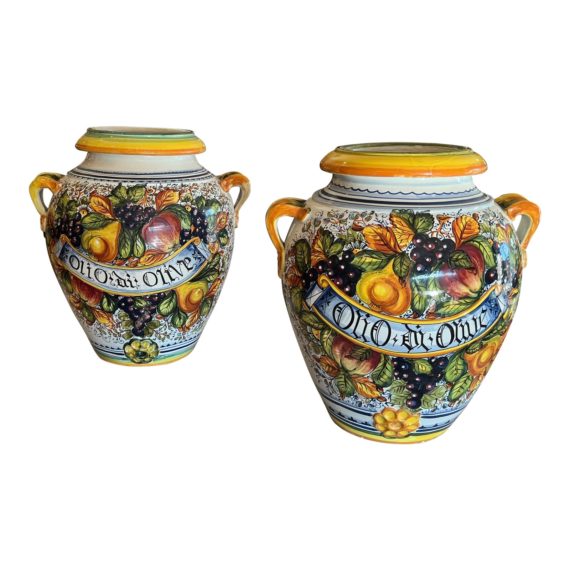 The “Olio Di Olive” pottery jars are truly one-of-a-kind, as each piece is individually hand painted by a skilled artisan. The attention to detail and craftsmanship is evident in every brush stroke, making this pair of jars a truly unique and special addition to your home. Visible and minor wear from usage.