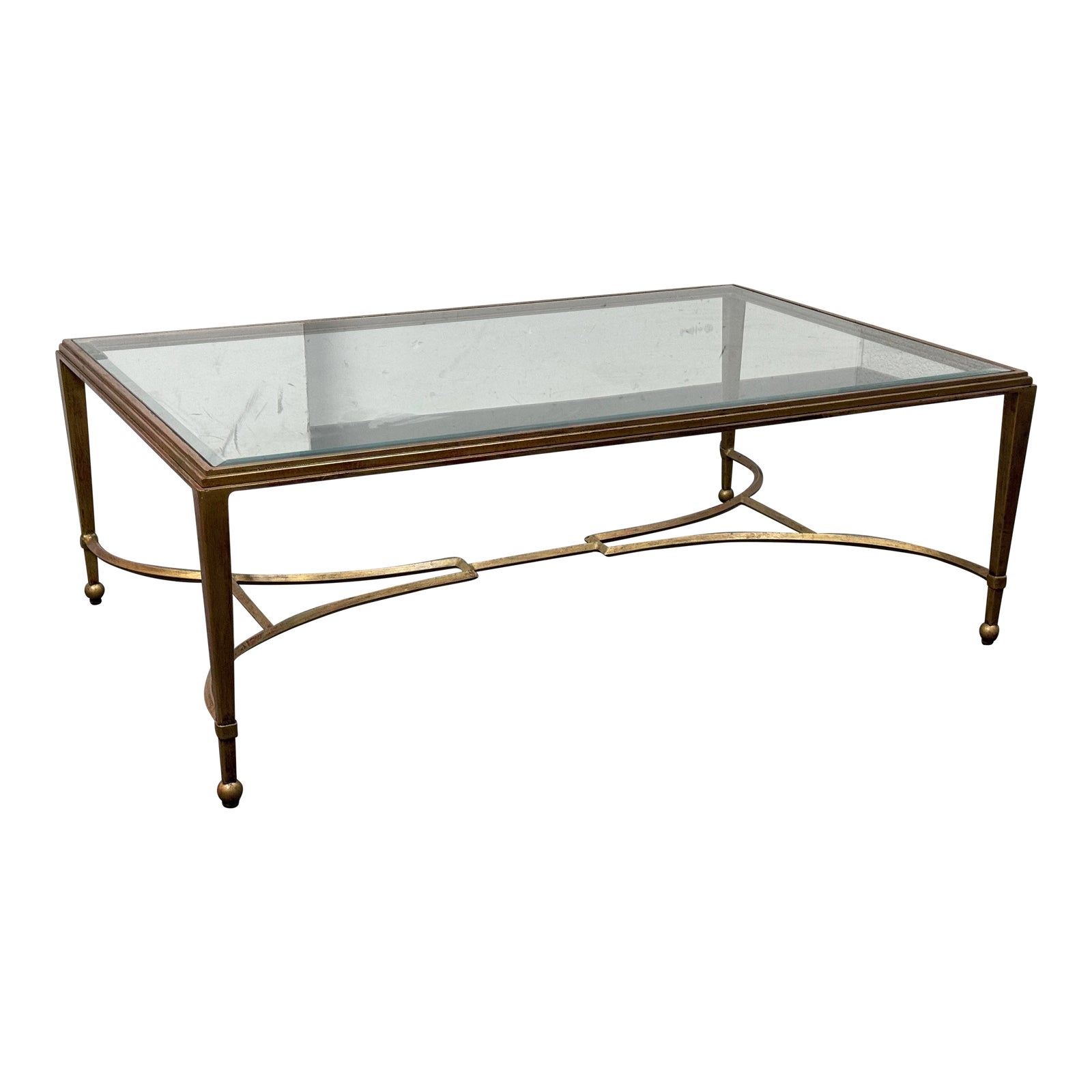 Design Plus Gallery presents the Sangiovese Large Rectangular Cocktail Table from Artistica Home. An Italian silhouette of a hand-forged solid tubular iron base. Down in an antiqued brass patina. There is an inset 1-inch beveled glass top. Quite a luxurious piece of tuscan styling. Visible and minor wear from usage + age.