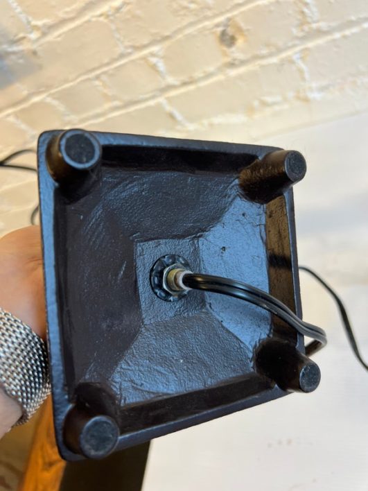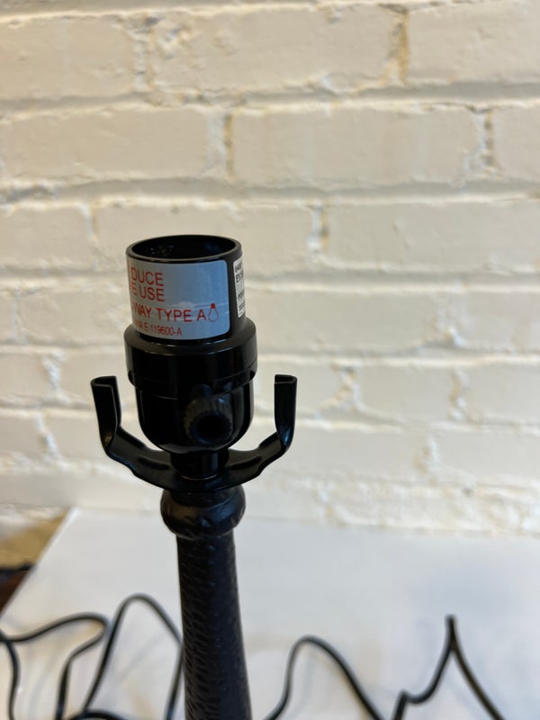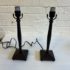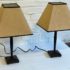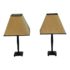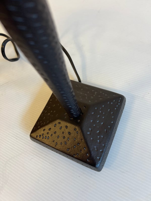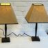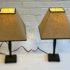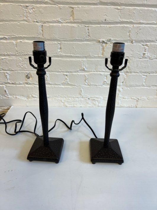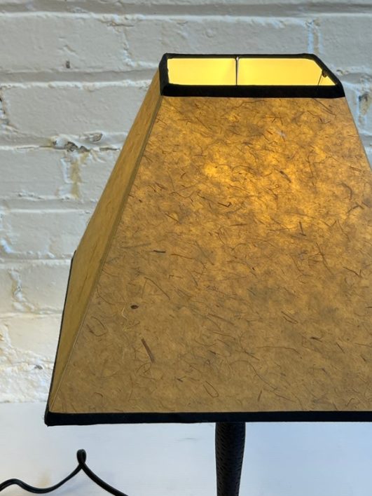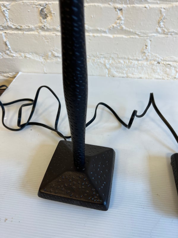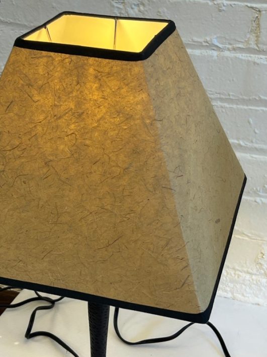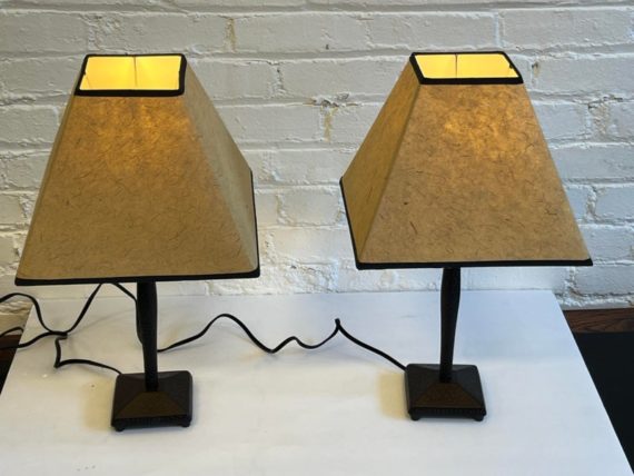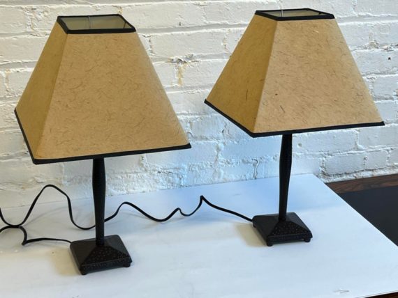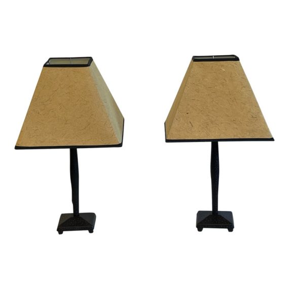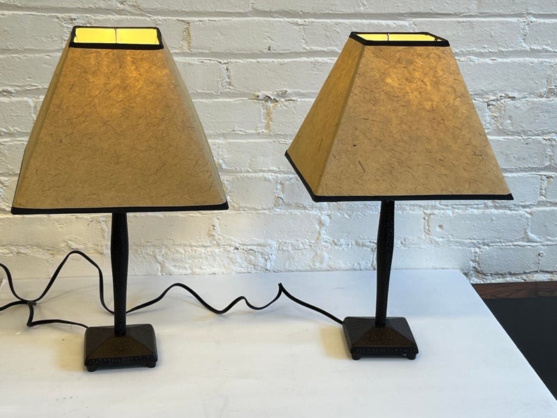Design Plus Gallery presents a Pair of Table Lamps with Hammered Iron Base and Paper Pyramid Shades. They are in the Arts & Crafts Style and will be great in a rustic setting. Both are in good condition with minimal wear.