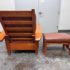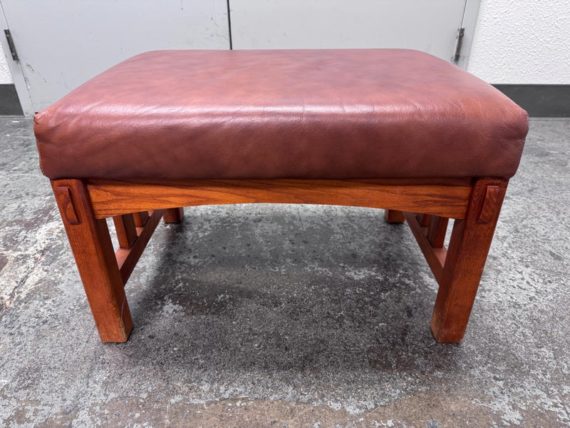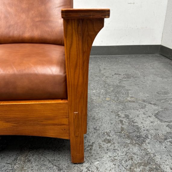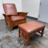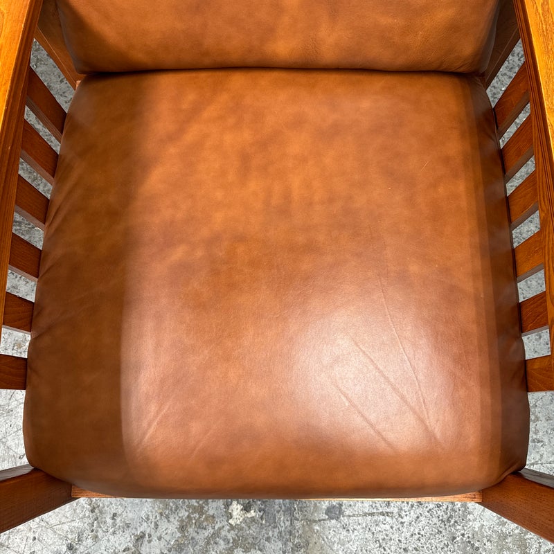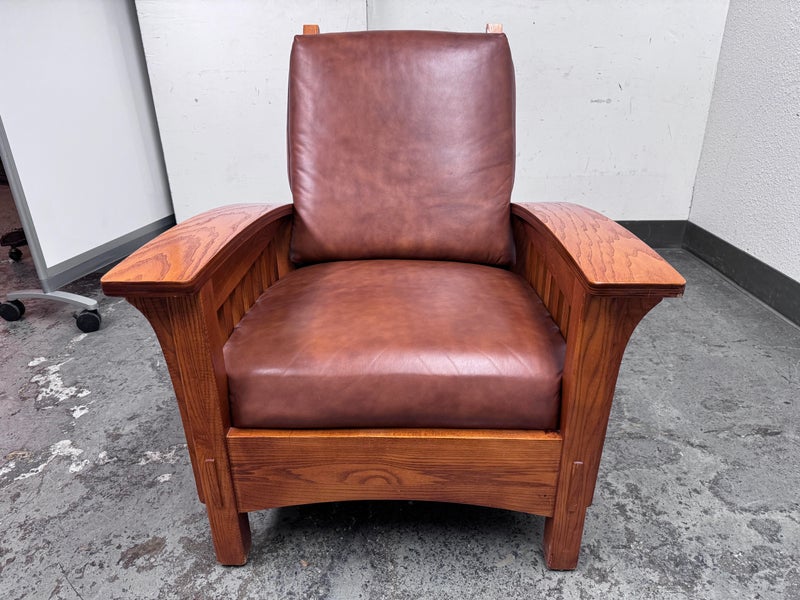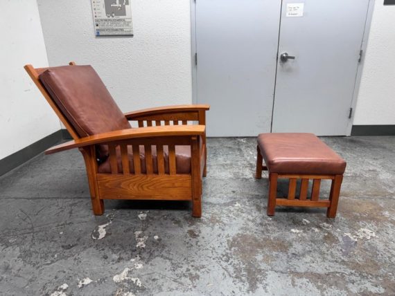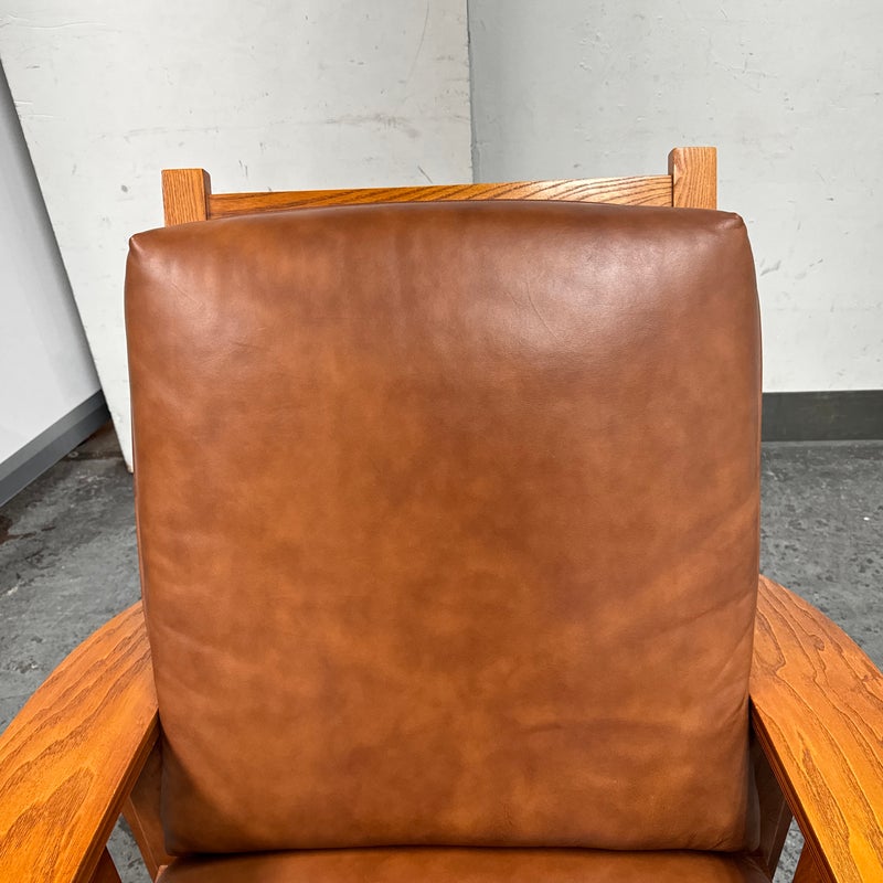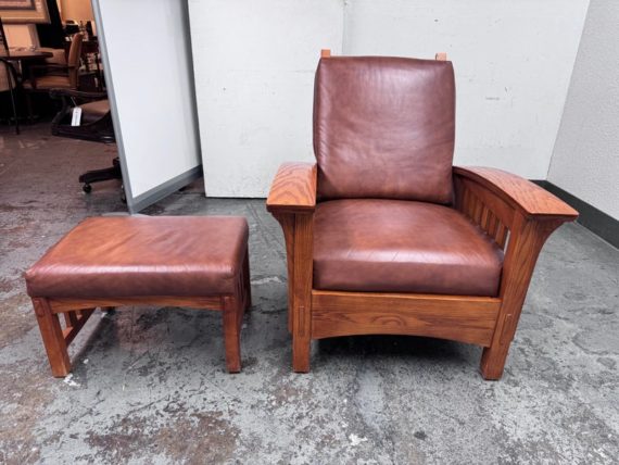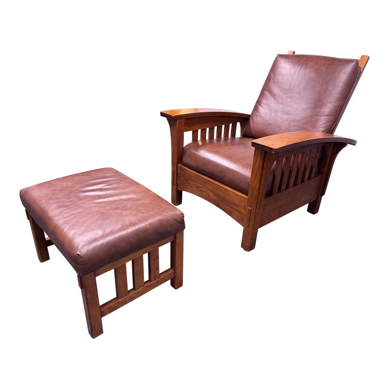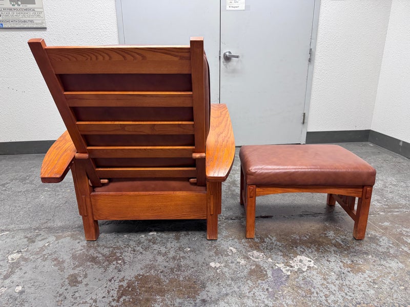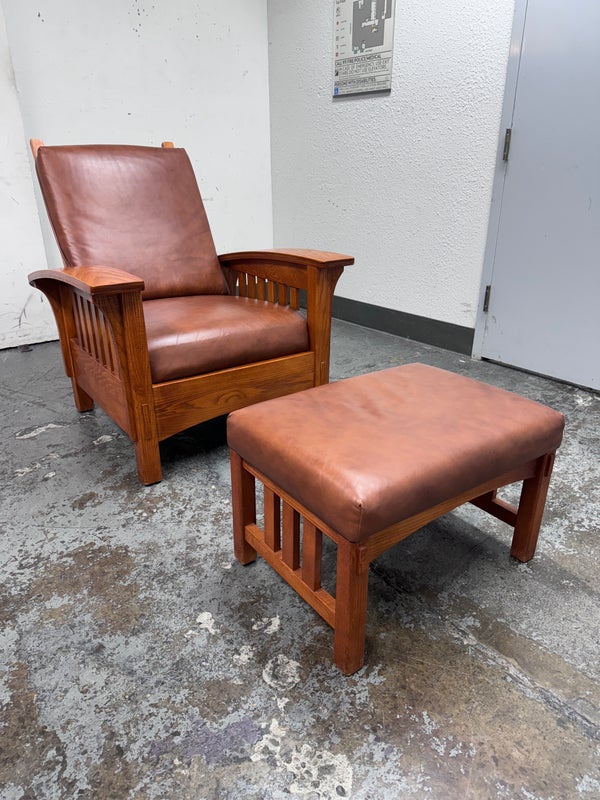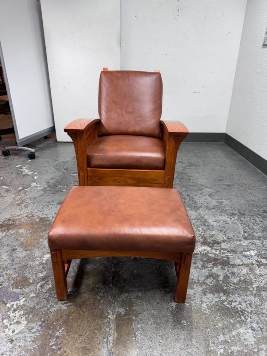 Design Plus Gallery presents a Set of Chair + Ottoman in the Arts and Crafts Style. The caramel leather is plush on both the back and seat cushion. The chair leans backwards and has craftsmanship style with attention to detail. They are both in good condition with minimal wear to the upholstery and wood.