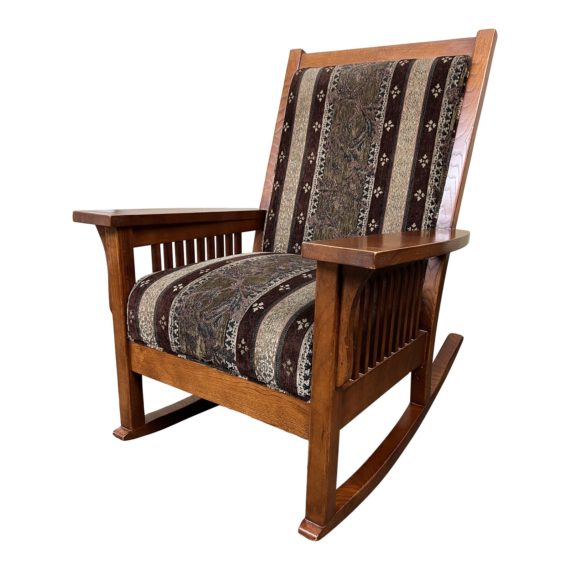 Design Plus Gallery presents an Arts & Crafts Oak Rocking Chair. Crafted from solid oaks, features a classic inspired Mission design with spindle sides. Upholstered in a neutral traditional tribal accented tapestry like fabric. Visible and minor wear from usage + age. Made in USA.
