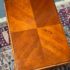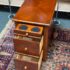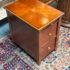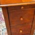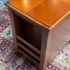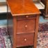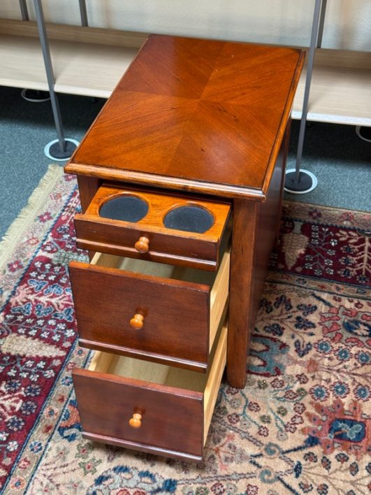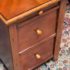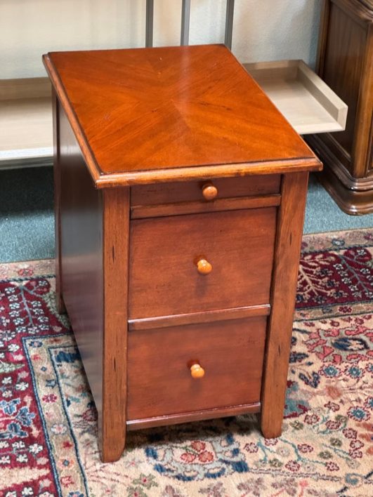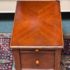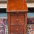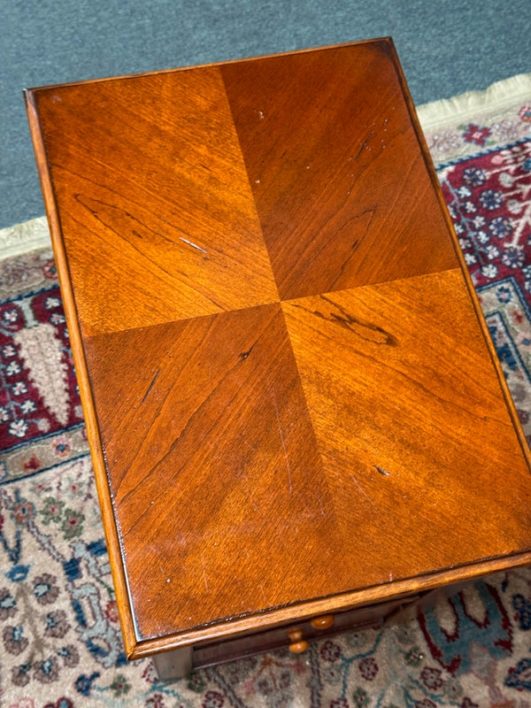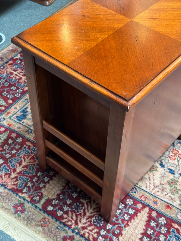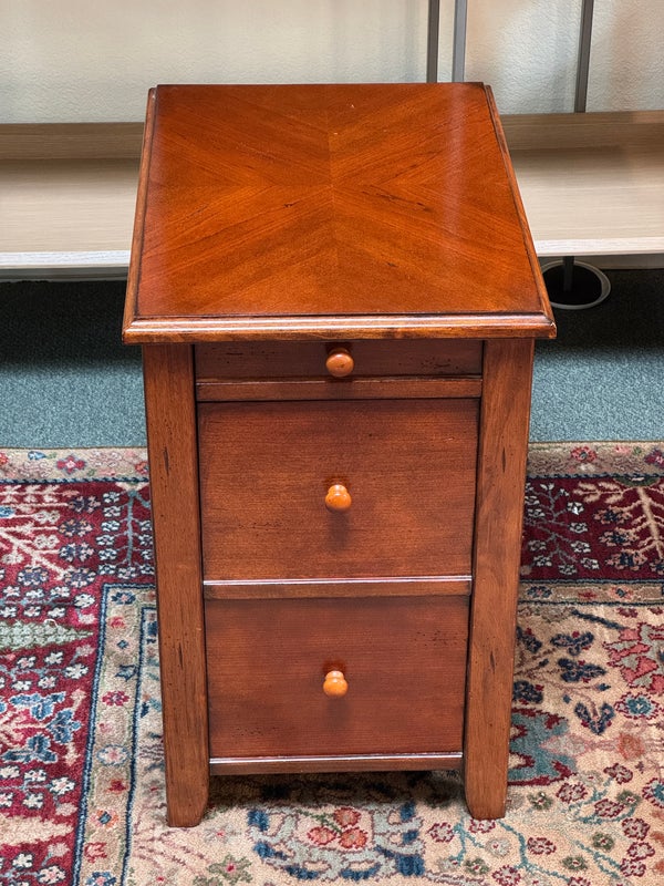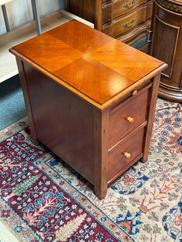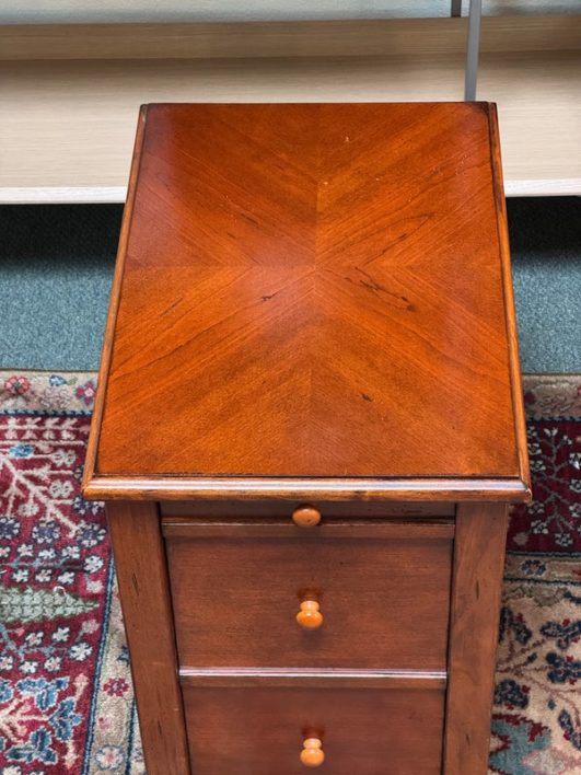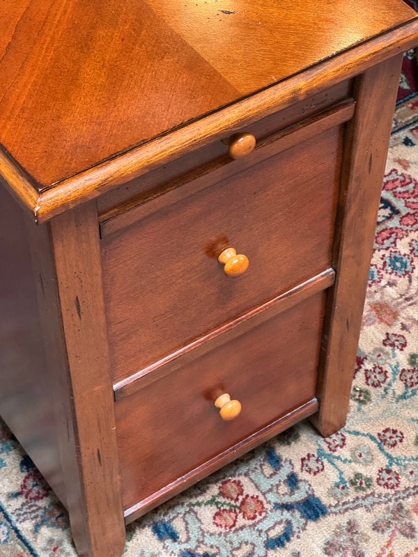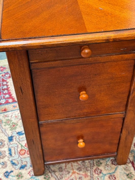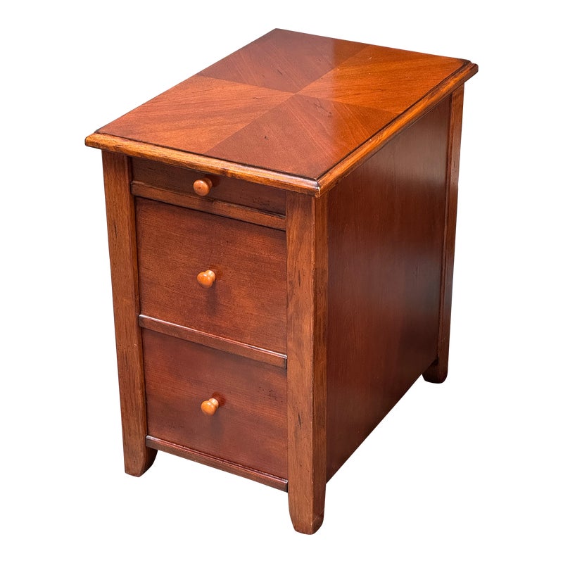 Design Plus Gallery presents an Arts and Crafts Style Bedside Cabinet. Crafted of solid wood, the simple silhouette is embellished simply with parquetry surface, turned knobs and a warm stain. Featuring a pull out shelf, fitted for efficiency, and two drawers for compact storage. Light surface wear; condition is good for age and use. Made in Thailand.