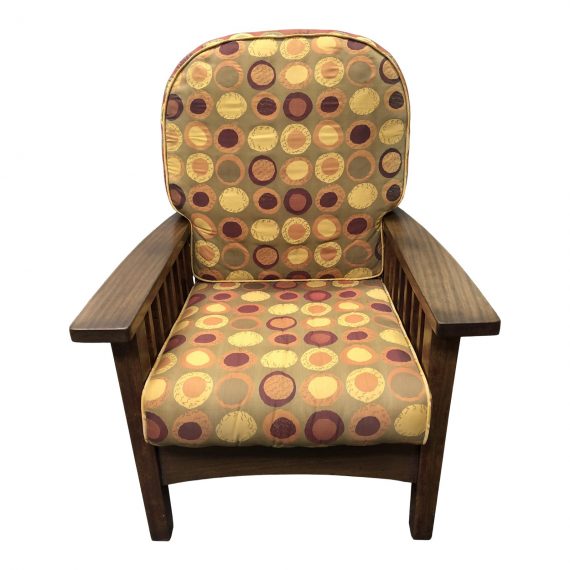 Design Plus Gallery presents an Arts & Crafts Arm Chair. The frame is constructed of solid wood with warm finishes. The frame has a discoloration due to sun exposure. The fabric is a geometric repetitive circular design. The piece has a custom plywood board underneath the seating. Seat and back cushion are removable. Arm Height: 24 inches, Seat Height: 7 inches