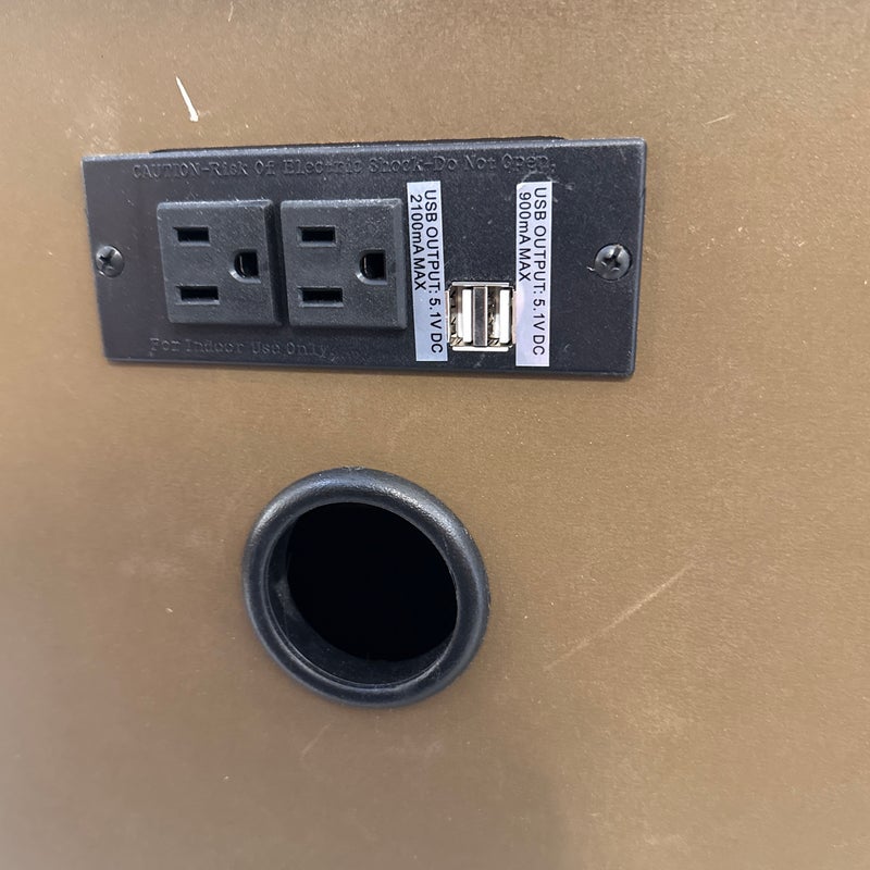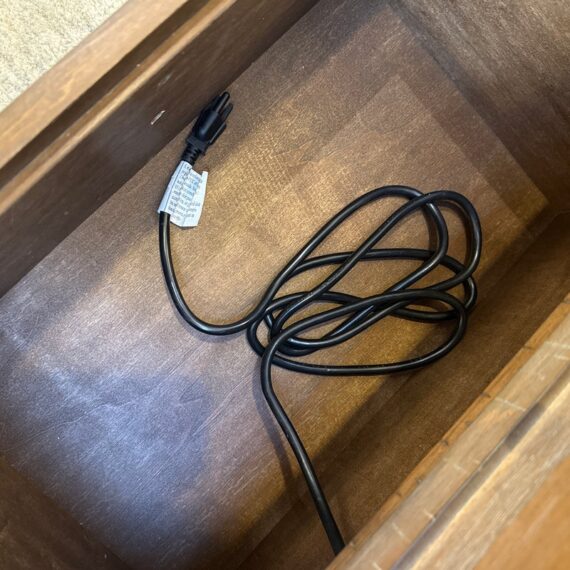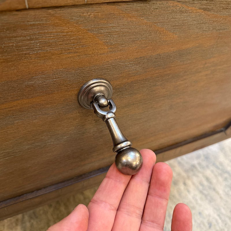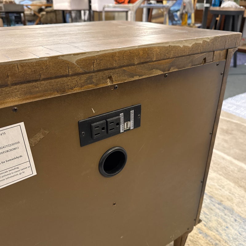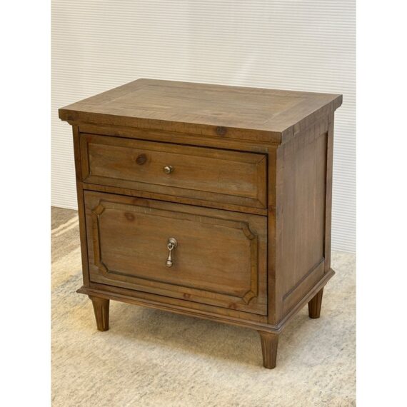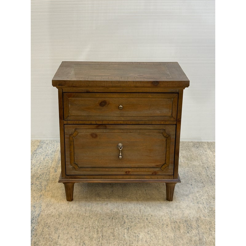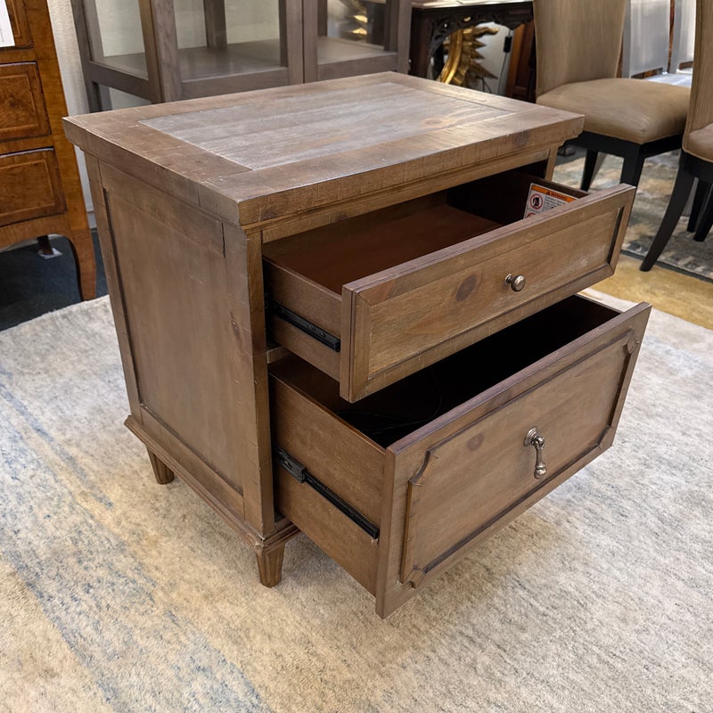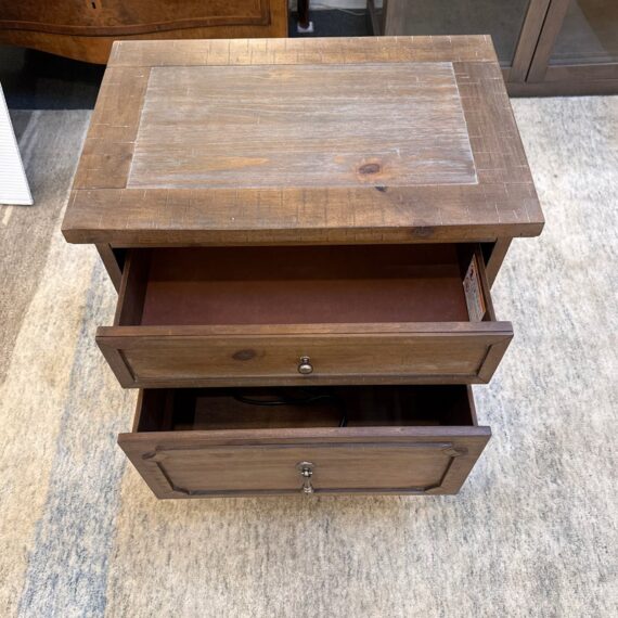 Design Plus Gallery presents Douglas Grove Nightstand from Artum Hill. Constructed from solid and engineered wood with the sturdiness of English dovetail joinery, while full-extension ball bearing glides assure you get the most out of the two-drawer storage. The felt-lined top drawer protects delicate and valuables. Traditional French country details abound with turned wood legs, framed drawer fronts, and antique silver hardware knob and drop pull. With innovative features such as a USB charging station and a power outlet, this nightstand blends new and old to be something magnificent. In good condition, visible and minimal wear.