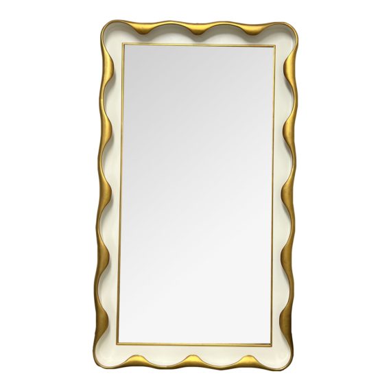 Design Plus Gallery presents a Venus Mirror by Global Views. Designed by Ashley Childers. Feminine curves and fanciful scallops are highlighted in gilded gold with an ivory backdrop. A lightly hand antiqued mirror gives a Hollywood Regency look to this mirror. Crafted of wood and wood composite. Minor wear, mirror is in good condition. Can be hung vertical or horizontal. Weight is 60 lbs.