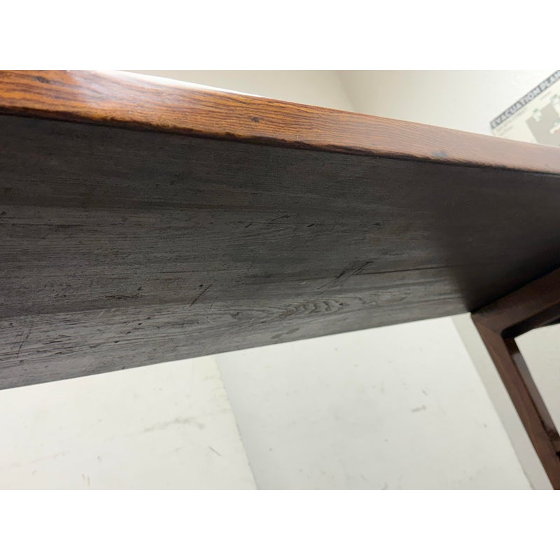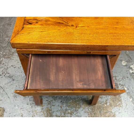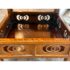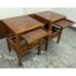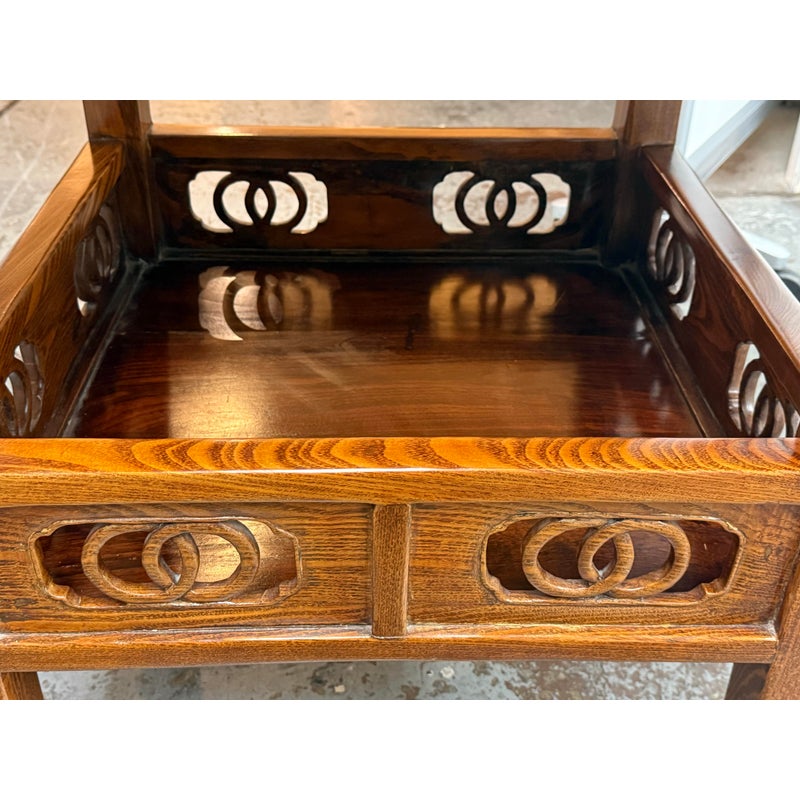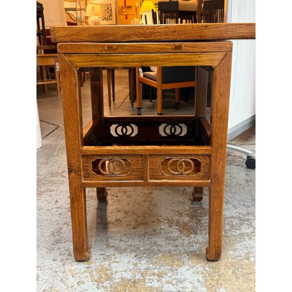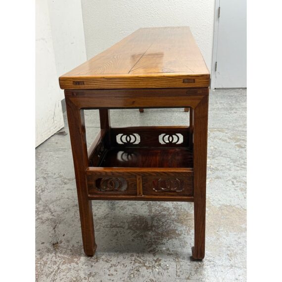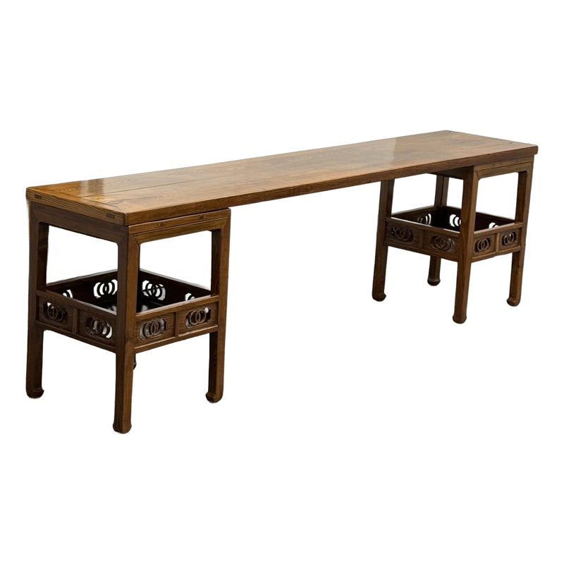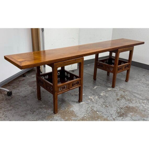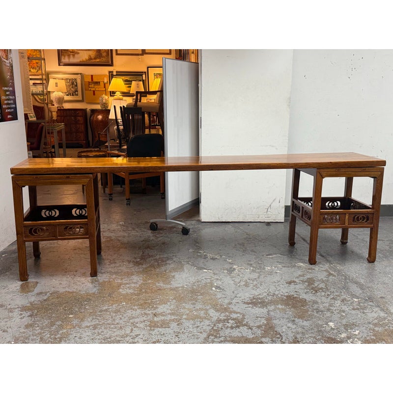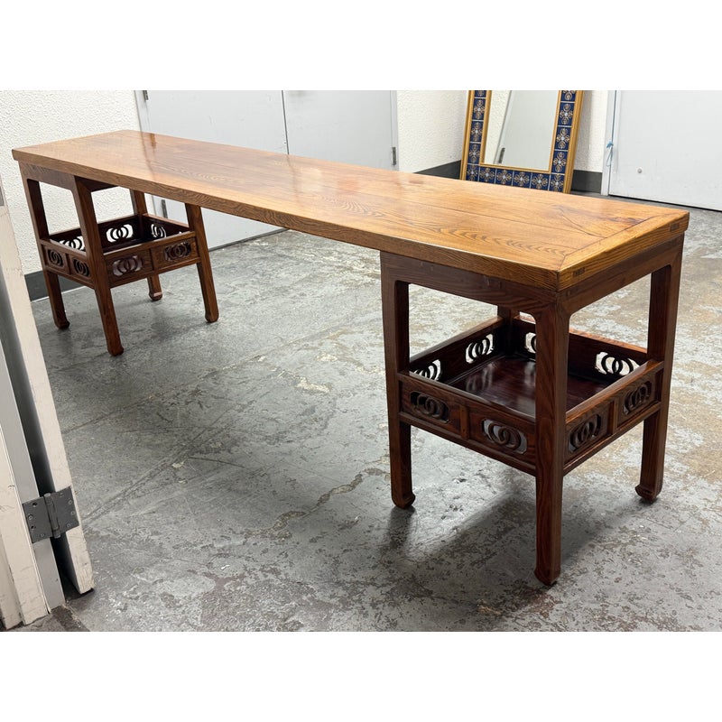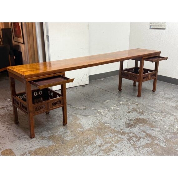 Design Plus Gallery presents a Rosewood Alter Table that is Antique + Splits in Three. There are two identical tables that have carved design elements to the single shelves gallery + a single slide out drawer on each. There is a long rosewood plank that is nicely finish that lives over the two tables. The antique piece is in good condition and was purchased at the SF McGuire Showroom in the year 2001. Minimal surface wear and is consistent with usage.