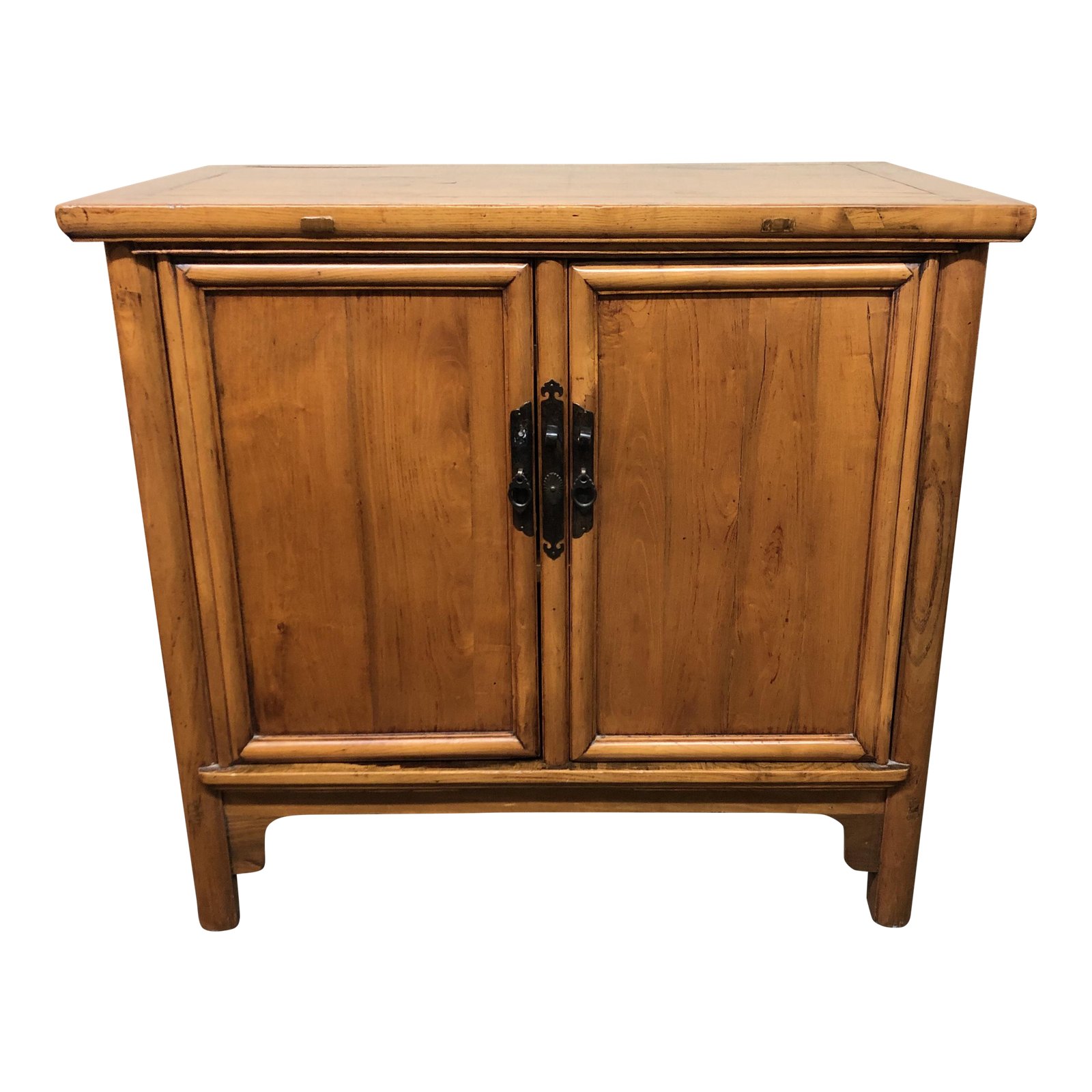 Design Plus Gallery presents an Asian cabinet. This vintage piece offers modern storage in an old world style. Two shallow drawers and a removable shelf behind doors. Lovely wood grain and iron fittings are the only embellishments needed. Key included.