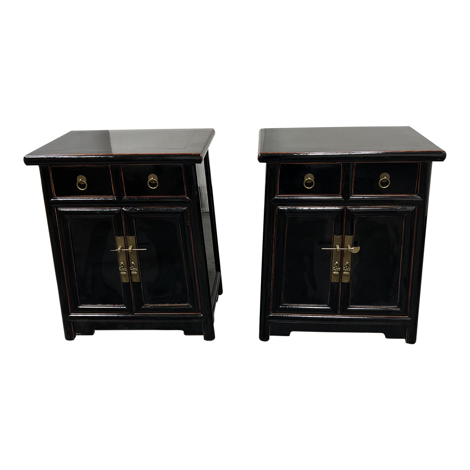 Design Plus Gallery presents a Pair of Asian Curio Wooden Black Lacquered Bedside Cabinets. There two precious bed tables have nicely appointed brass hardware, with a locking piece to contain the shelving at the bottom. There are two equal size drawer with O-ring brass pulls that slide and move effortlessly. The table top and general wear show good condition, with wear that is consistent with age and usage.