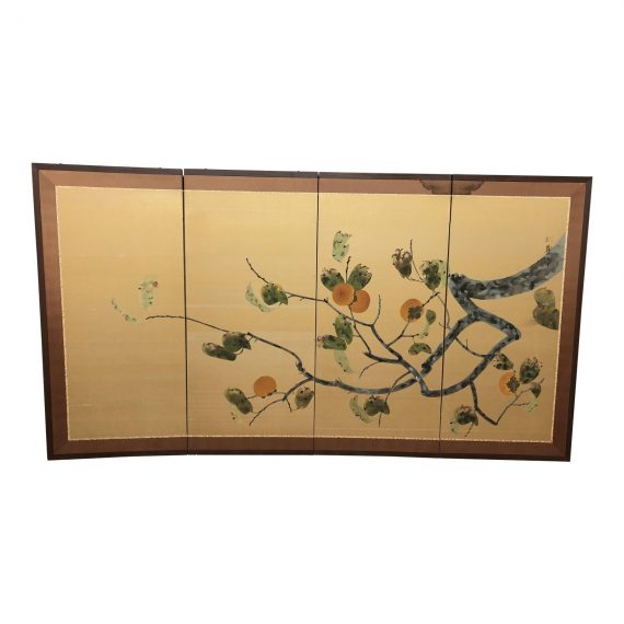 Design Plus Gallery presents an Asian Screen + Room Divider. The four panels create a study of a persimmon tree at full fruit. Calm with subtle coloring, the silk front is borded in complementary hues. Reverses to an allover pattern.