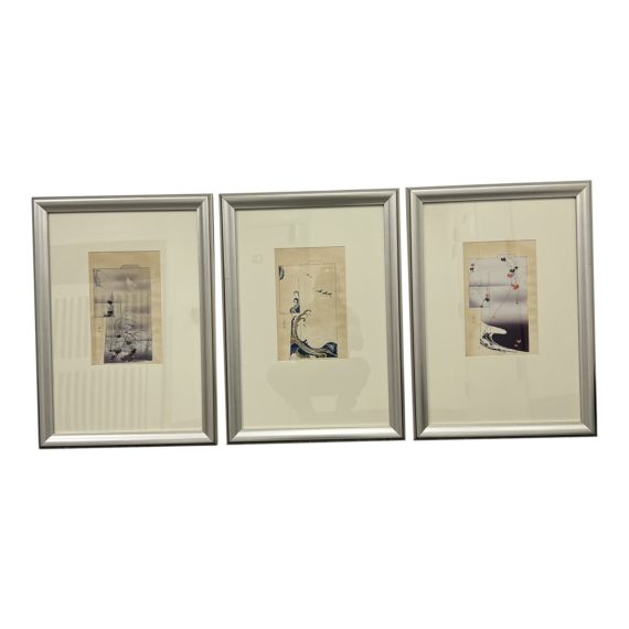 Design Plus Gallery presents a Set of Three Asian Influenced Framed Kimono Robes Hanging Artwork. The art represents the artwork that goes into each individual kimono, making these appealing in that they are all unique. One feature waves, the other blowing reeds in the wind and the last an interpretation in black and red. All are equally encased in the same silver beveled frame with identical cream matting. Good conditions, with wear that is consistent with age and usage.