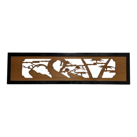 Design Plus Gallery presents an Asian Influenced Framed Maple Transom. Originally used as a header for a door way, the beautiful wood carvings have been updated with a black frame. Minor wear on surfaces, good condition. Panel requires hardware for wall hanging.