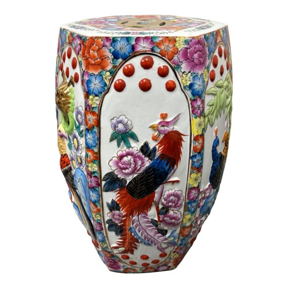 Design Plus Gallery presents a Lovely Outdoor Garden Stool of Asian Inspired Design. The colors of the beautiful fauna and florals are all over the stool with brass details over a white background is a great addition to your home or garden. Indoor or outdoor this is a great tool to use to hold lightweight items. Is in good condition, with minor small crack on the bottom and some fading to the paint.