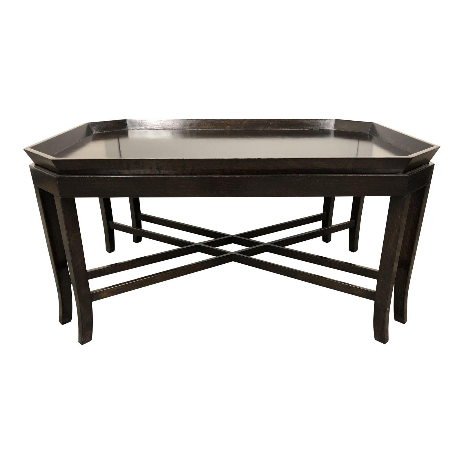 Design Plus Gallery presents a Asian inspired coffee table. A removable tray with a eight legged wood base. The wood has a dark finish which enhances the wood grains. The base has a criss-cross frame. A suitable addition for the living room.