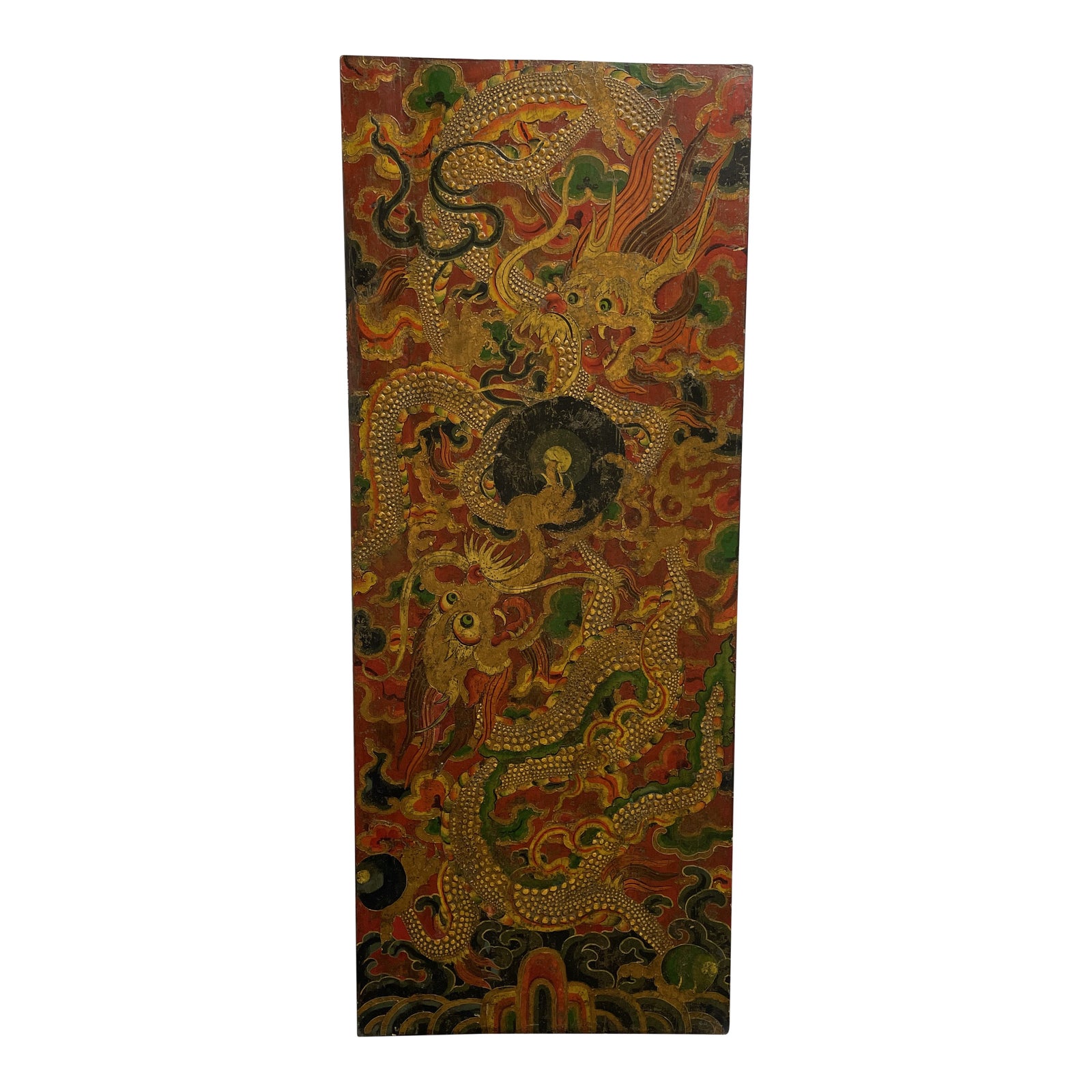 Design Plus Gallery presents Asian Late 19th Century Textured Dragon Painting on Panel. Two dragons intertwine within the tight composition around a central black sphere. Textured surfaces workaround the lines and scales of the texture. Surfaces are antiqued from time and add to the character of this unique art piece.