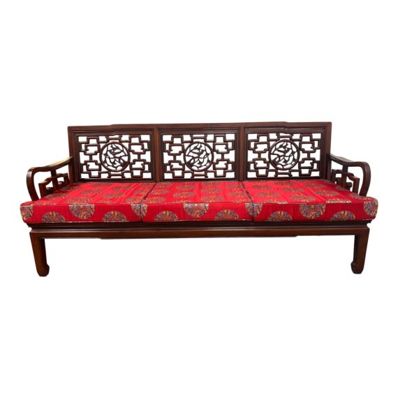 Design Plus Gallery presents an Asian Rosewood Sofa. Rosewood is beautifully carved with chinoiserie reliefs on the backs and arms. Center of back is anchored by a medallion with a bird amongst cherry blossoms. Cushions slide perfectly around the arm and back supports. Firm seat cushion is upholstered in a medallion patterned red silk as well. Minor wear on surfaces.