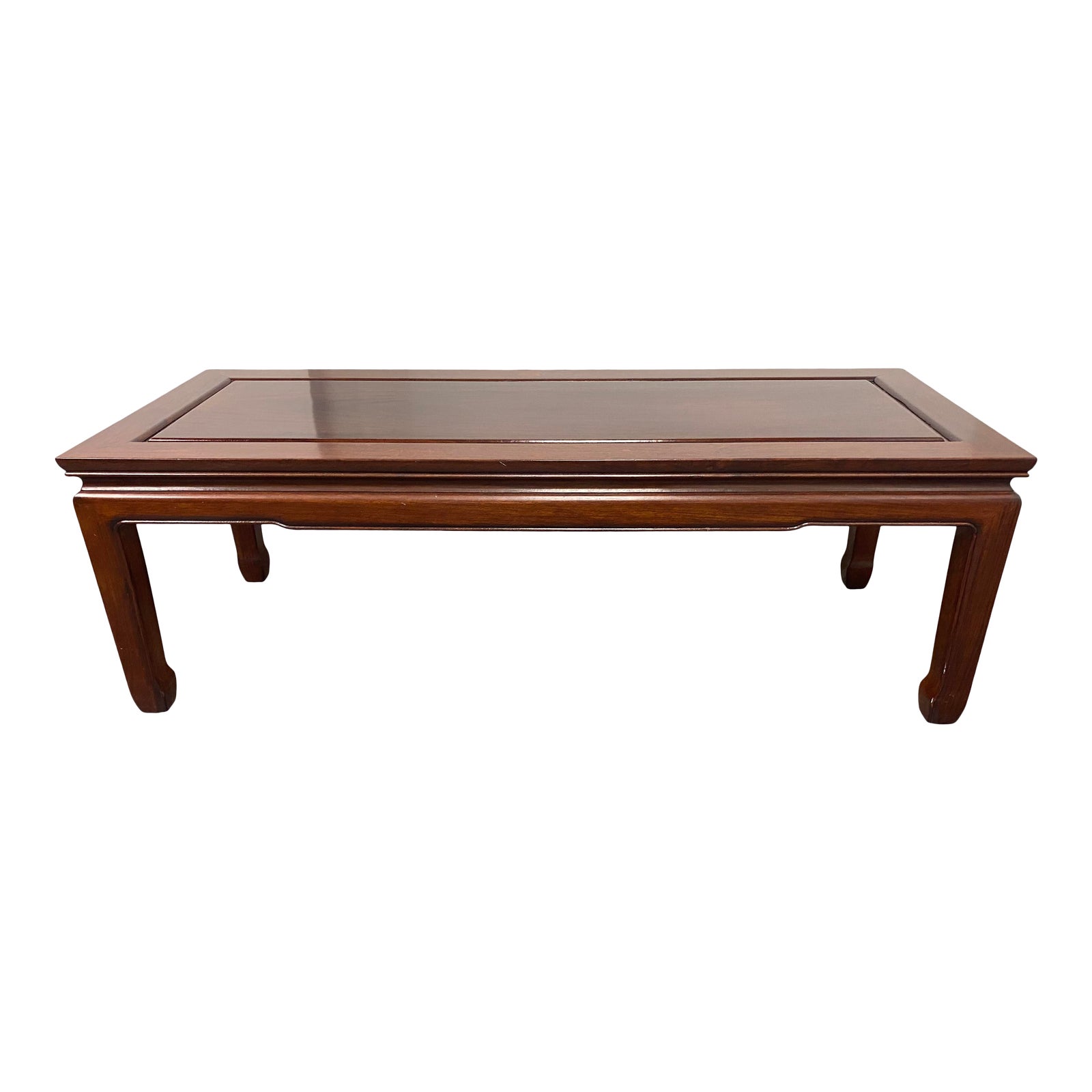 Design Plus Gallery presents an Asian Rosewood Coffee Table. Solid rosewood is carved elegantly into a timeless silhouette with a satin lacquer to preserve the rich burgundy depth of the wood grain. Minor wear on surfaces.