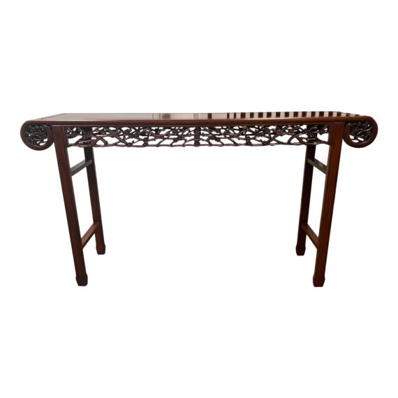 Design Plus Gallery presents an Asian Rosewood Console Table. Beautifully carved solid rosewood is molded into cherry blossoms stretching from the center to the sides of the curved console. Curved sides anchor birds in each center. Legs reinforced with stretcher bars. Minor wear on surfaces.