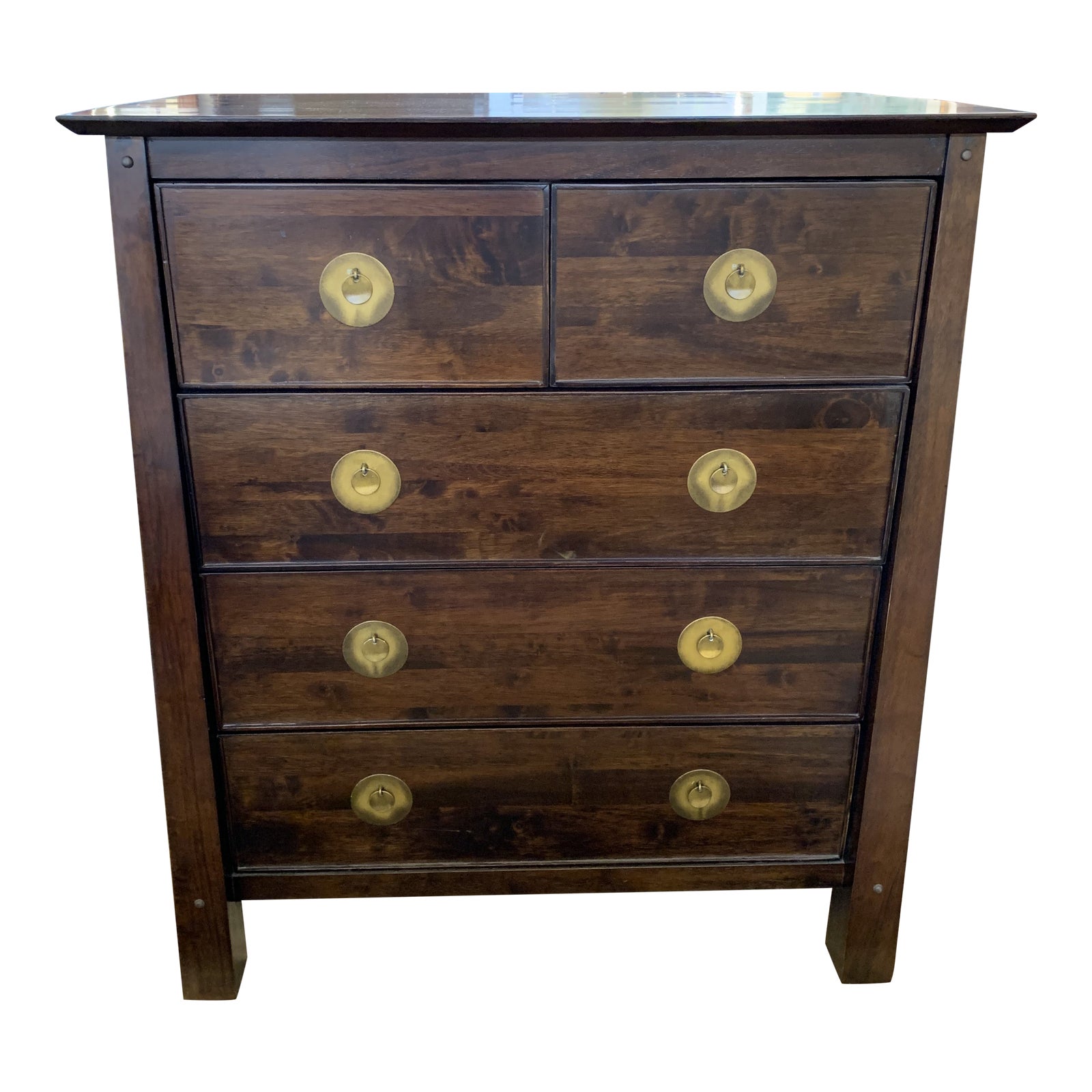 Design Plus Gallery presents an Asian Style Dresser. Five roomy drawers are finished in a dark wash that allows the woodgrain to show through, unique brass pulls provide a subtle Asian touch to the transitional styling.