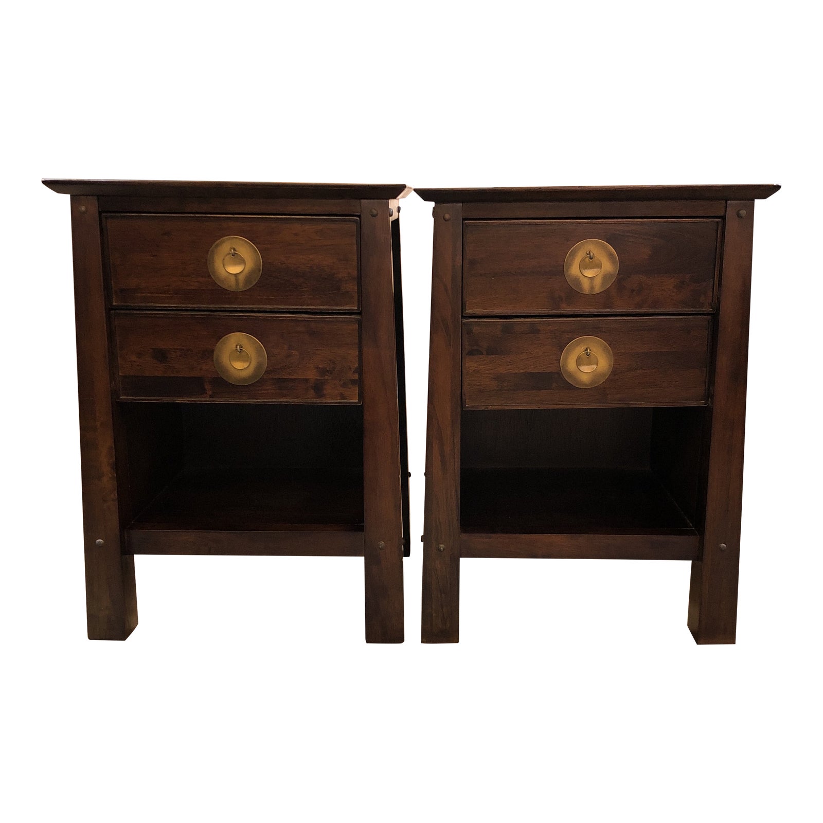 Design Plus Gallery presents an Asian Style Pair of Nightstands. Two roomy drawers and a shelf on each cabinet are finished in a dark wash that allows the woodgrain to show through, unique brass pulls provide a subtle Asian touch to the transitional styling. Matching 5 drawer dresser and 6 drawer dresser may be available.