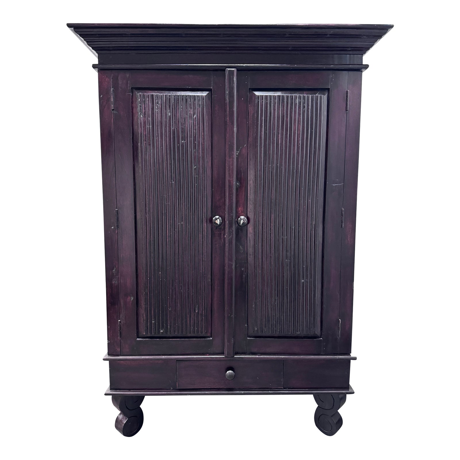 Design Plus Gallery presents a Hand Crafter Rosewood Media Cabinet or Storage Armoire of Presenting as an Asian Antique. The cabinet has a large inner cavity that is perfect for containing a television and lower dual shelving for other electronics of necessities. One single lower drawer to storage smaller items like remotes and controllers. Both doors open entirely to rest against their sides. The knobs have an added metal ring to make the piece easier to open and close. Is in good condition with some visible wear and modifications that are consistent with age + use.