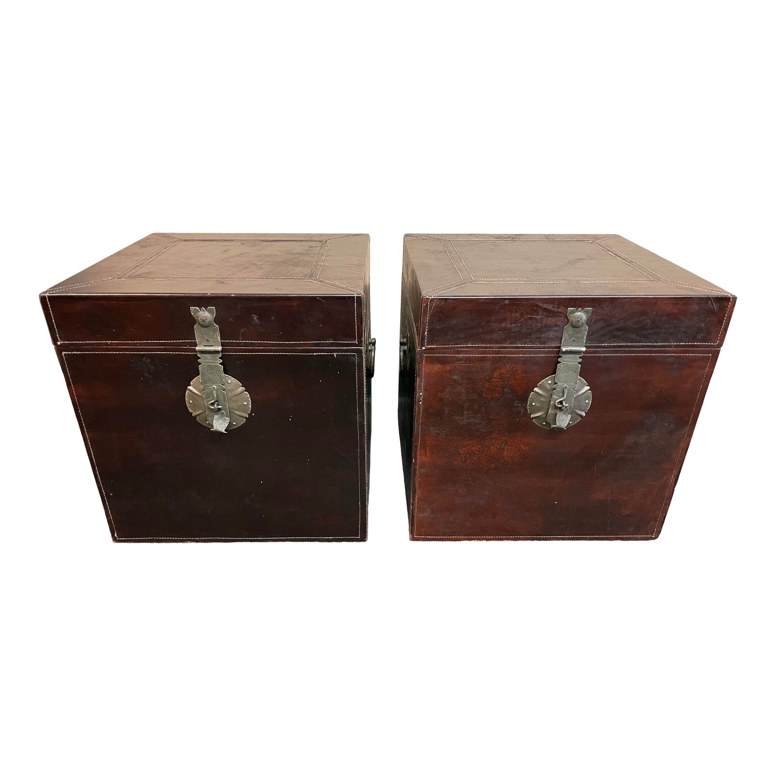 Design Plus Gallery presents a Pair of Chinese style Cubes. Wrapped in bonded leather and embellished with stamped metal locks and forged handles. Turned feet, included, can be attached easily to raise the height of the cubes. Metal hinges are NOT soft close, these are not for use as toy storage. Some evidnece of wear; leather does not match exactly. Work nicely as nightstands or end tables.
