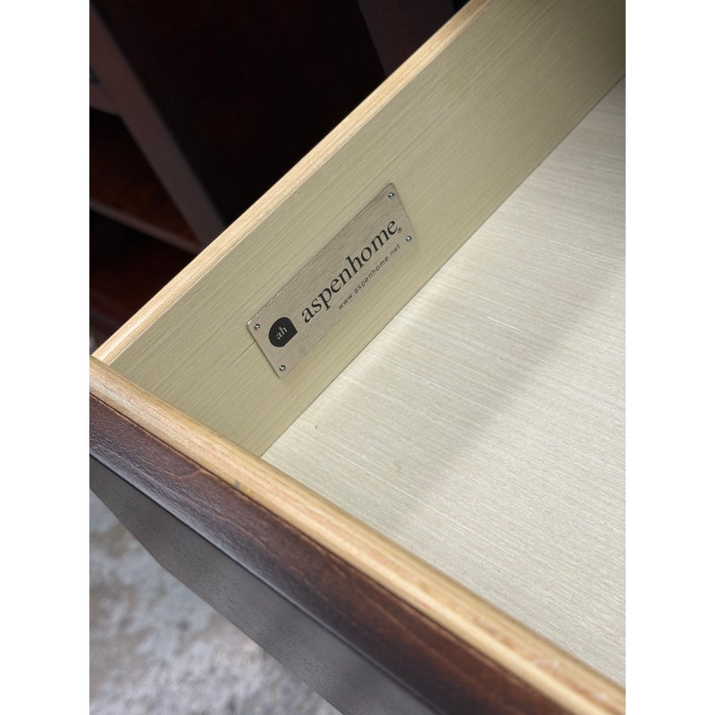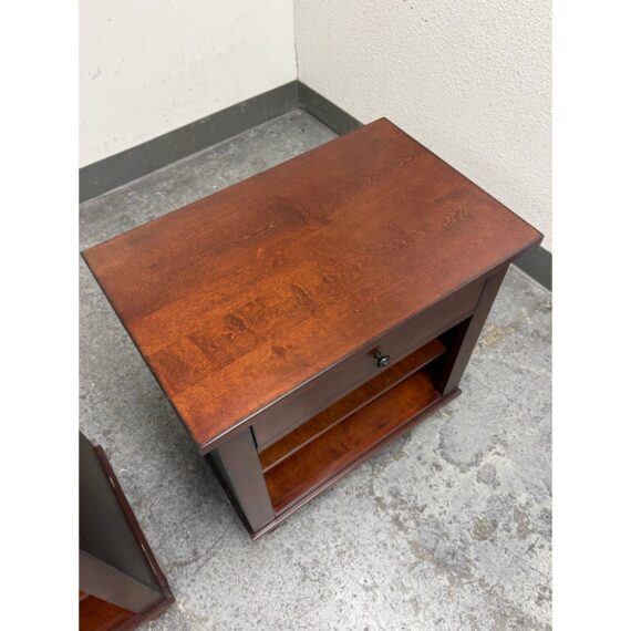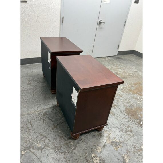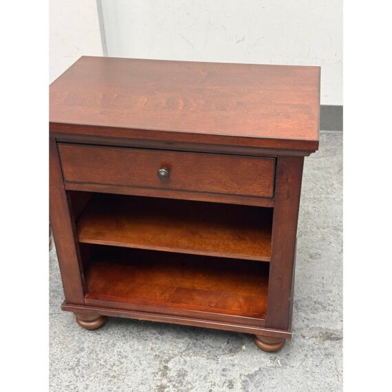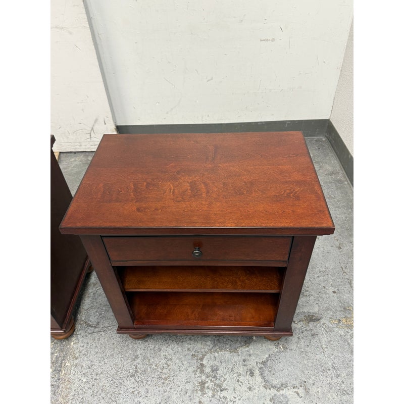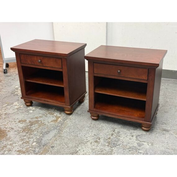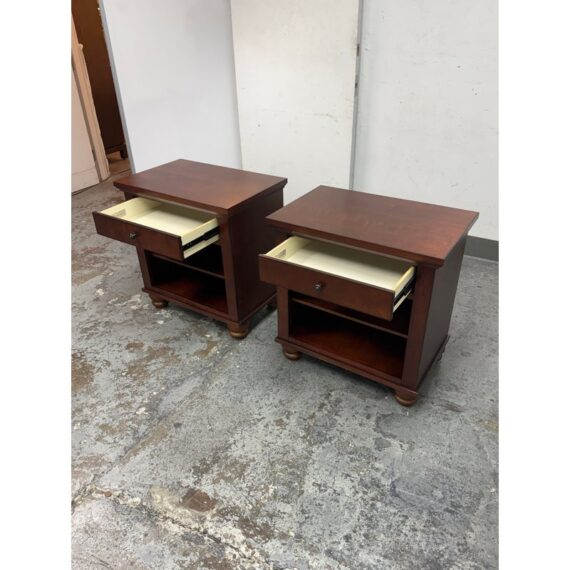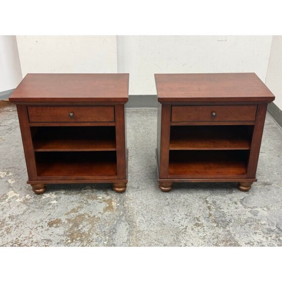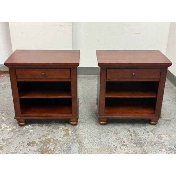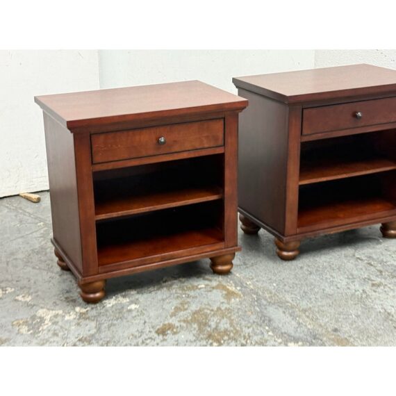 Design Plus Gallery presents a pair of Cambridge Brown Cherry Nightstands from Aspenhome. Each nightstand is made with hardwood solids and birch veneers and includes a single drawer with dovetail joinery, full extension steel ball bearing drawer slides, an open storage section, an adjustable shelf, and round pewter hardware. Framed construction and turned feet complete the traditional profile. They are in good condition with visible and minimal wear from usage.