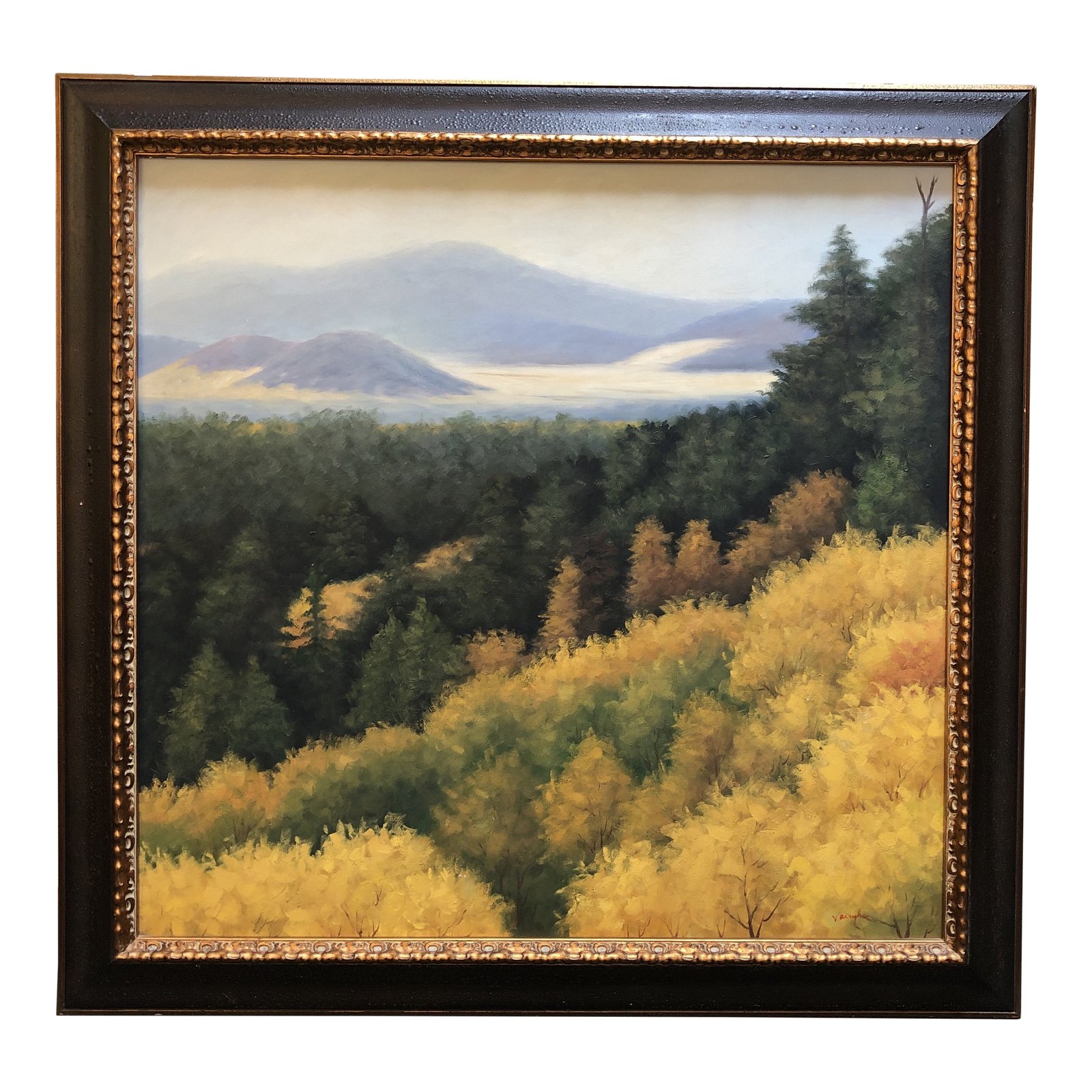 Design Plus Gallery presents Autumn Mountains by Vaughn. A soothing landscape, the saturated colors of the Fall season are shown at their peak, against a deep green background. Mountains and an alpine lake complete the restful scene.