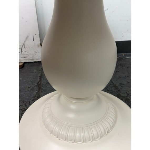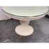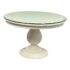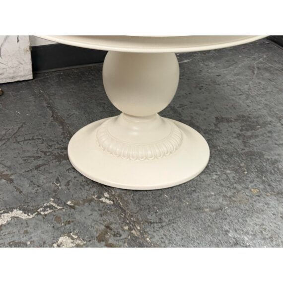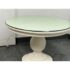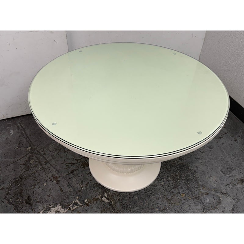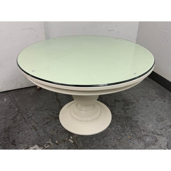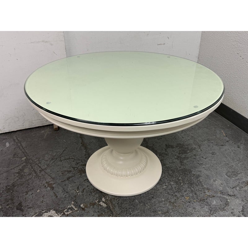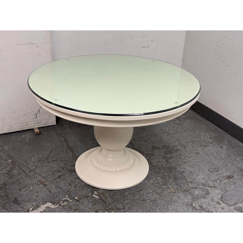 Design Plus Gallery presents the Charlotte Pedestal Table from Ave Home. The table offers a balanced silhouette with a carved pedestal base and a round top that emphasizes its decorative details. A white-toned surface pairs with a protective glass top, creating a polished look while keeping the surface protected. The table is sized to seat four comfortably, and the pedestal form allows generous leg clearance around the perimeter. The design draws on traditional motifs while maintaining a streamlined overall profile that suits a wide range of interior styles. The finish is discontinued with the brand and is in good condition, visible and minimal wear from usage.