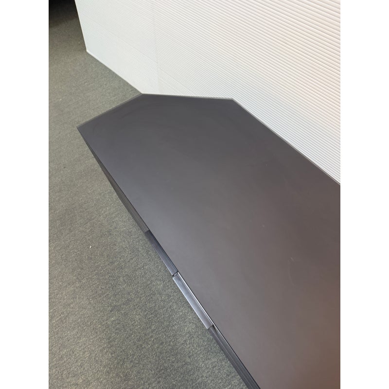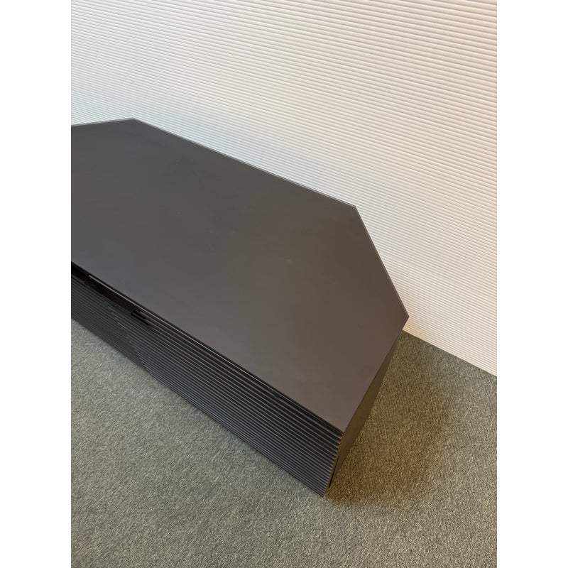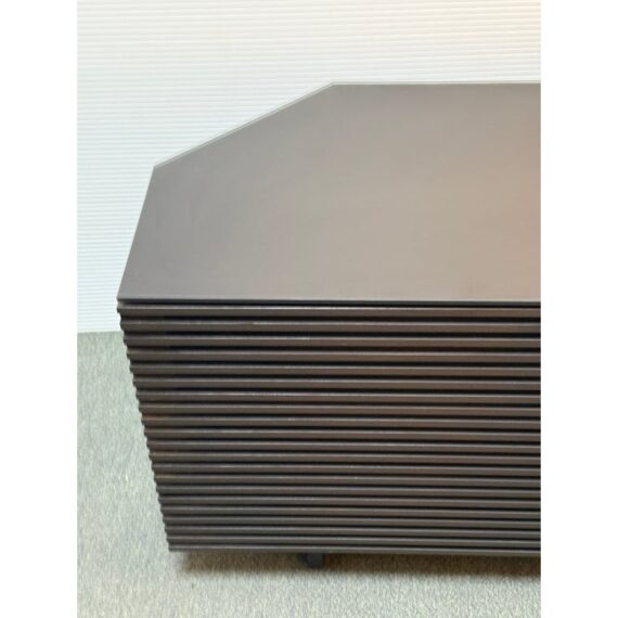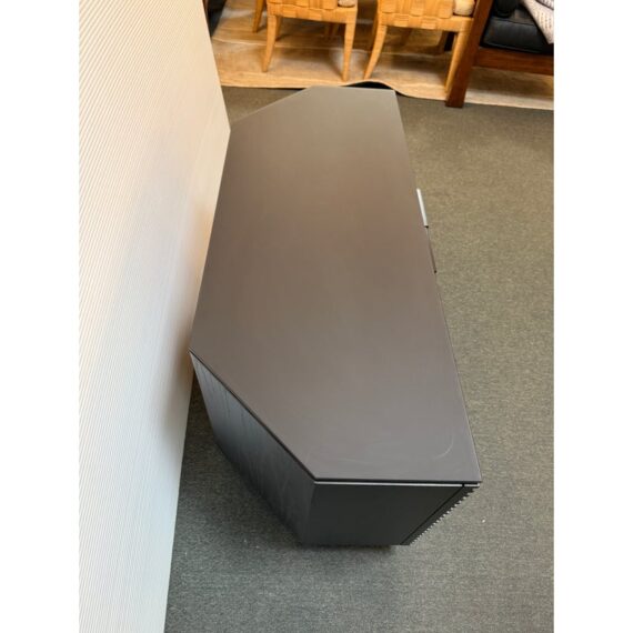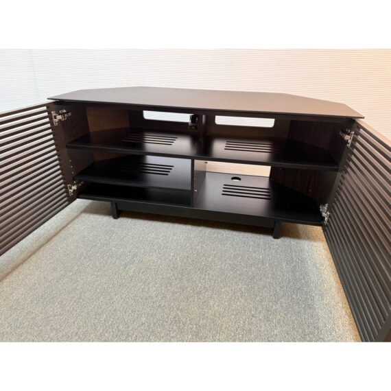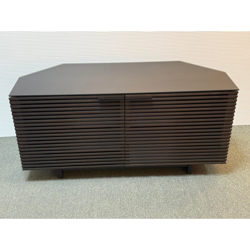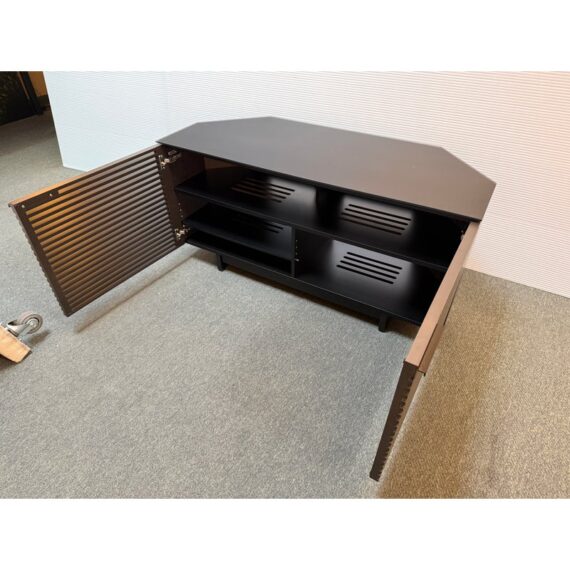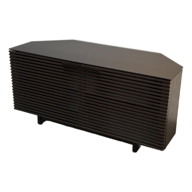 Design Plus Gallery presents a Corridor Corner Cabinet by BDI designed by Matthew Weatherly. Offering modern design and ample media organization, even in a tight space. Fronted by louvered wood doors, and topped with black glass, this charcoal-stained ash cabinet has tapered rear panels for a perfect fit into corners, or place flat against your wall. Behind the contemporary (ventilating) doors are multiple adjustable spaces for the organization and easy use of media or office. The cabinet has minimal signs of wear which is consistent with usage.