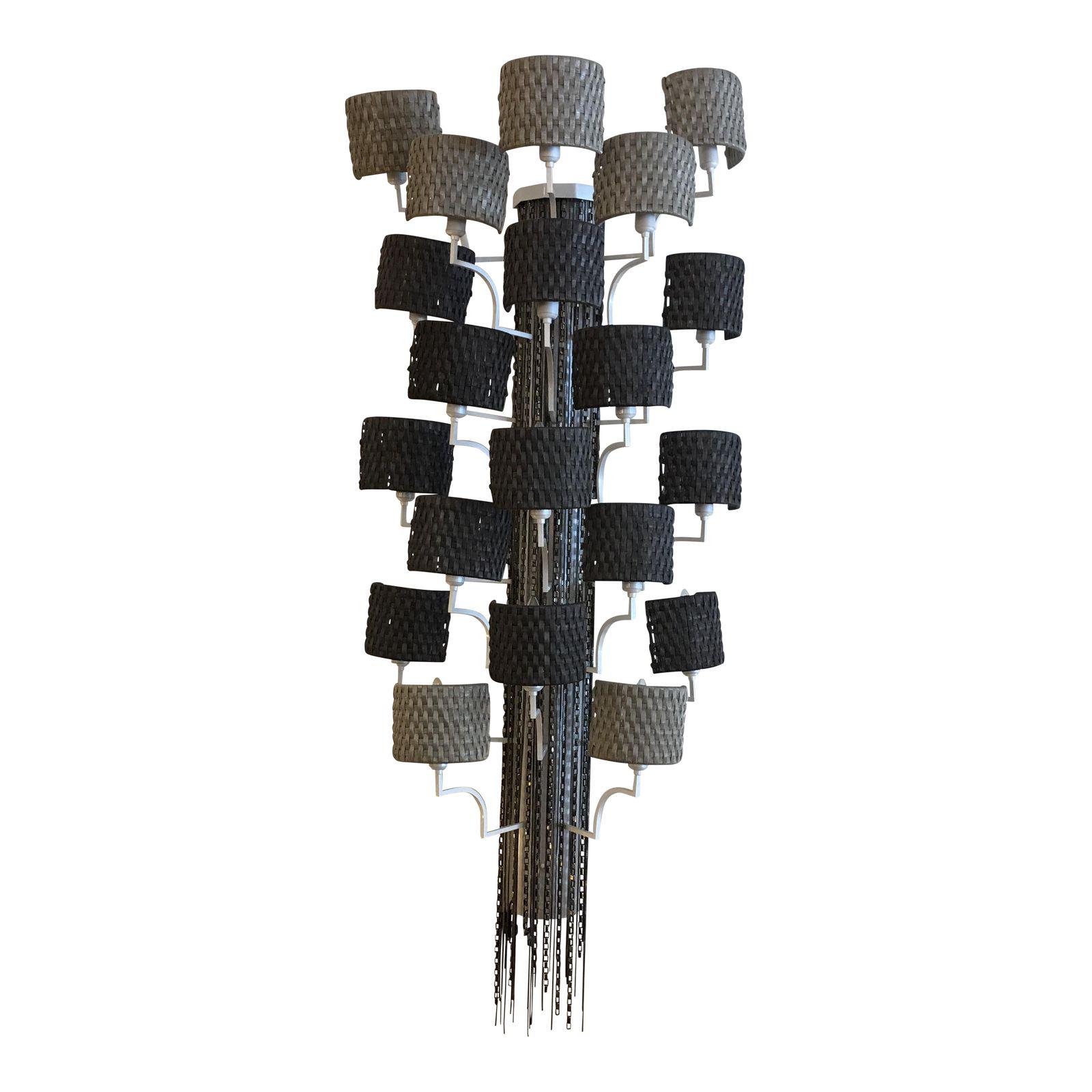Design Plus Gallery presents a very unique walls sconce. The fixture has twenty bulbs on it, each bulb is covered by a shade which has been constructed using wire mesh ribbons woven together. Some of the shades are Charcoal in color and the others are Silver adding depth and dimension to the fixture. Minor conditions, one arm needs repairing. As if that was not enough the elongated shape of this light has been draped with loose metallic chain which looks and acts like fringe. If you are looking for something different, you don’t have to look any further.