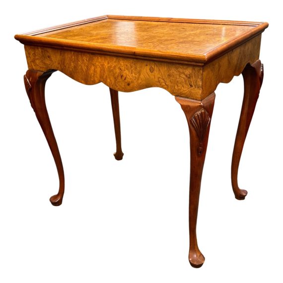 Design Plus Gallery presents a Vintage Burlwood Side Table by Bark Furniture. Beautiful active burl wood is embellished with scalloped apron and carved cabriole legs. Light surface wear; condition is good for age and use.