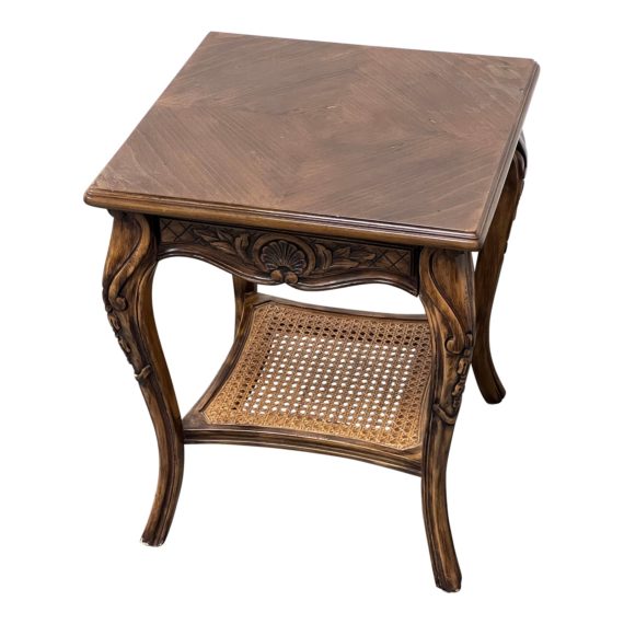Design Plus Gallery presents a Queen Anne Style Oak Wood Single Drawer Dresser with Caned Shelf from Baker Furniture Company. High quality dovetailed drawer with Drake feet. In good condition with some visible surface wear. Will need new refinish.