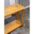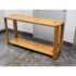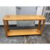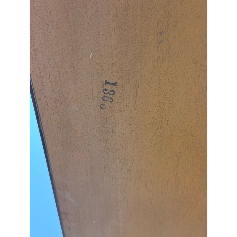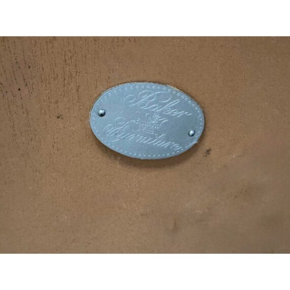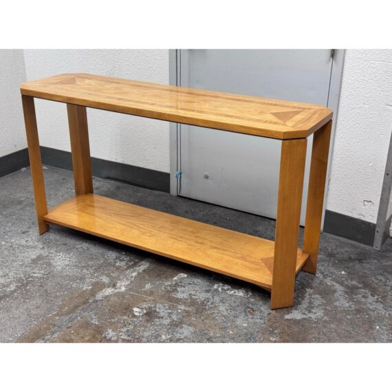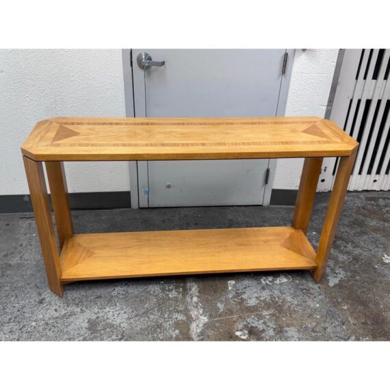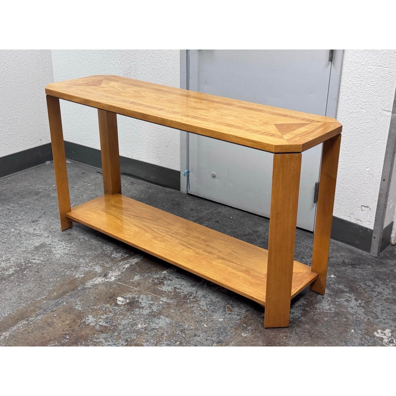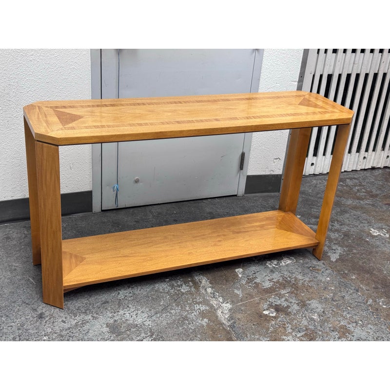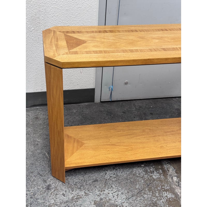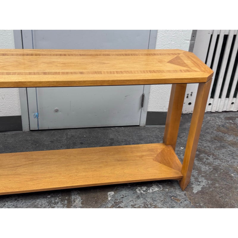 Design Plus Gallery presents a Console Table from Baker Furniture. The console is likely from the late 20th century and has a light wood tone. There are two shelves with four connecting legs of thin concave light wood planks. The inlay on the top surface has a darker tone of wood in two triangles on either side with a faint border following the lines of the rectangular console table. The brand plate for Baker is adhered to the underside of top surface. Visible wear such as sun fade and scratches is present but overall the console is in good condition for its age + use. Made in USA.