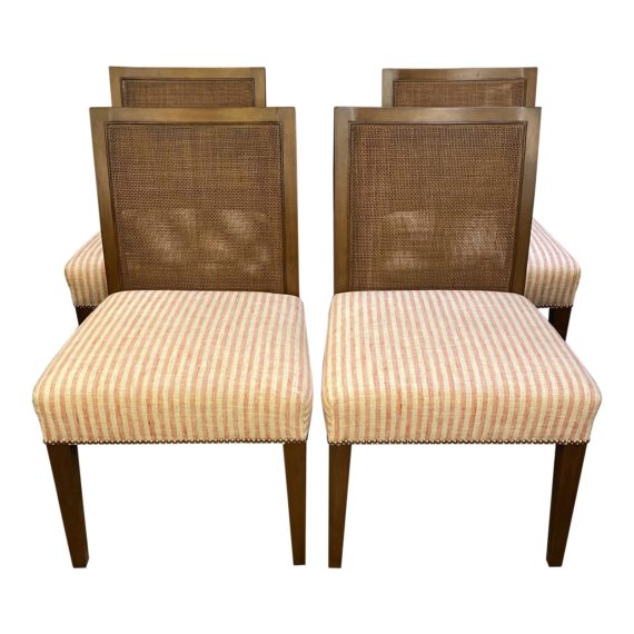 Design Plus Gallery presents a set of four Custom + Cane Dining Side Chairs. Caned backs have double layering for a moire effect. Frame is stained with a rich Chestnut stain. Coordinating Captain’s Chairs might be available. Chairs have an Ivory + Brick Red striped fabric reminiscent of a Belgium linen. Oiled brass nail head detail lines the perimeter of the seat. Minor wear on surfaces.