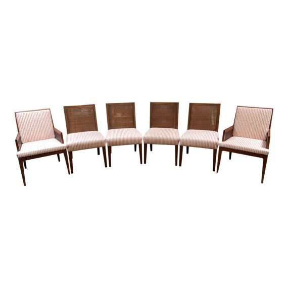 Design Plus Gallery presents a set of four Custom + Cane Dining Side Chairs. Caned backs have double layering for a moire effect. Frame is stained with a rich Chestnut stain. Coordinating Captain’s Chairs might be available. Chairs have an Ivory + Brick Red striped fabric reminiscent of a Belgium linen. Oiled brass nail head detail lines the perimeter of the seat. Minor wear on surfaces.