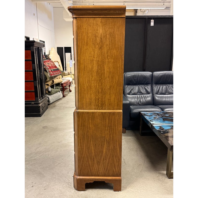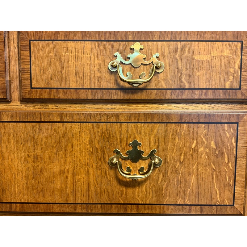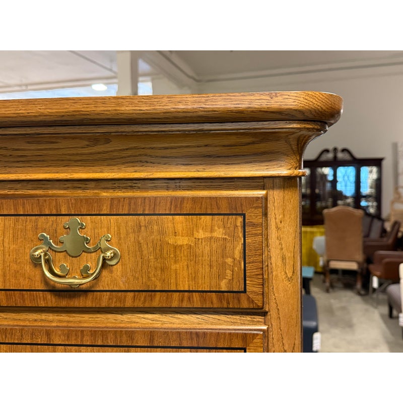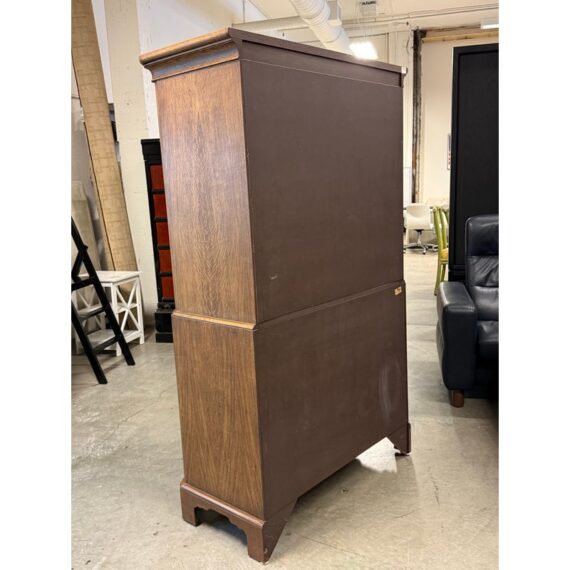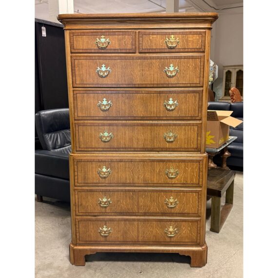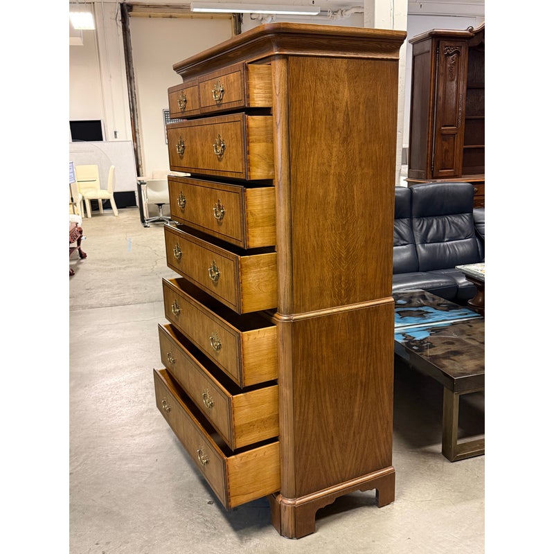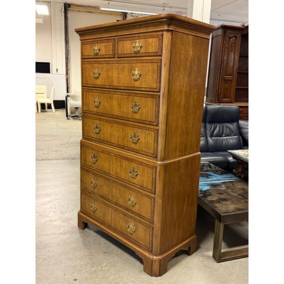 Design Plus Gallery presents the Chippendale Style Tall Chest of Drawers from Baker Furniture. The eight drawer chest of drawers has a sophisticated presence. Its stands on thick, low profile legs with subtle carvings for detail work. All drawers have their original brass hardware that is ornate in design. The top two drawers are half width to the dresser with the remaining six being full width. The tall dresser is in good condition for its vintage usage. Made in the United States of America.
