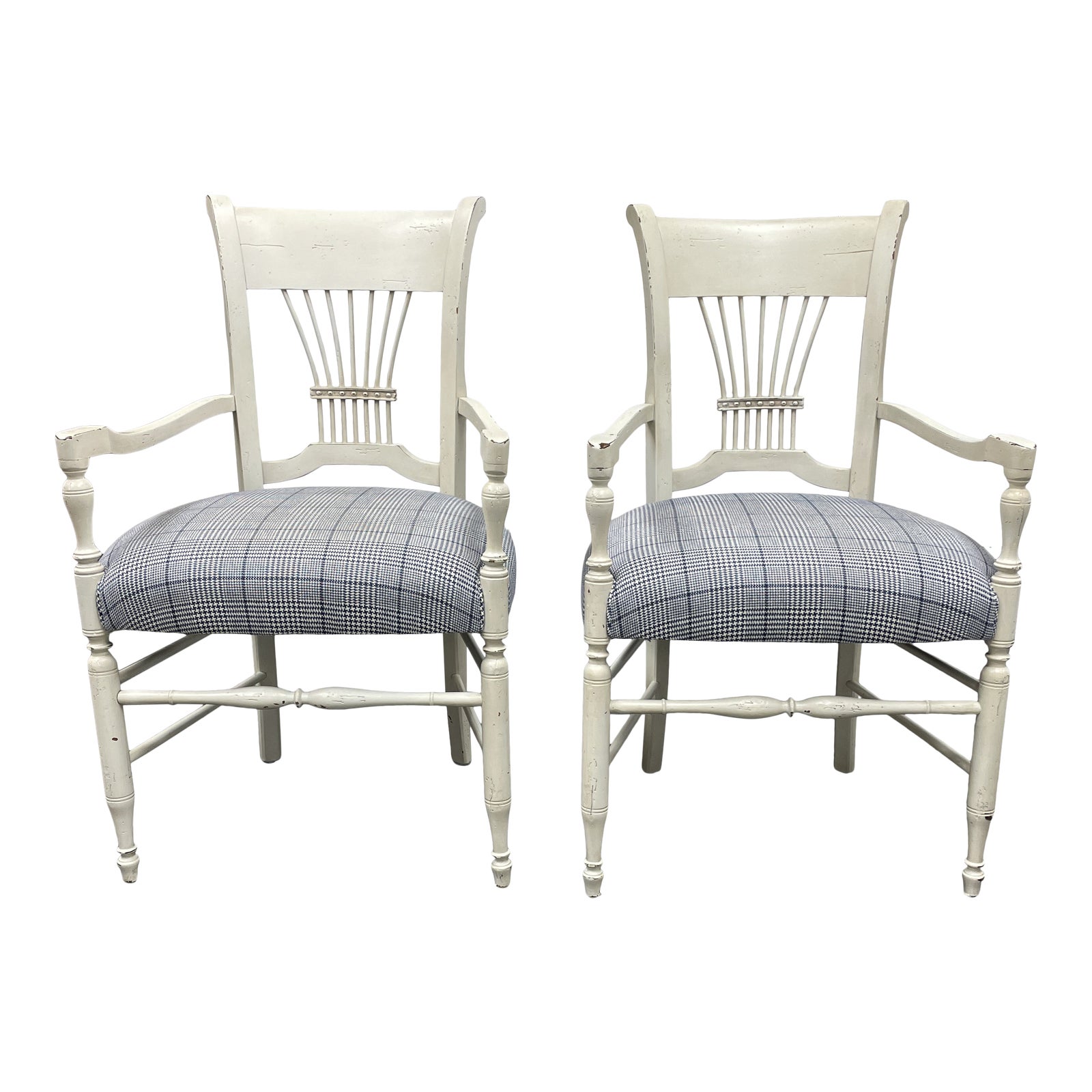 Design Plus Gallery presents a Pair of Baker Furniture Milling Road Spindle Arm Chairs. Made with the craftsmanship that Baker is revered for in North Carolina. Wood Frame references European elegance with turned legs and spindle splat back. Seats are firmly upholstered with a navy and cream plaid fabric. Distressed finish. Visible and minor wear on finish.