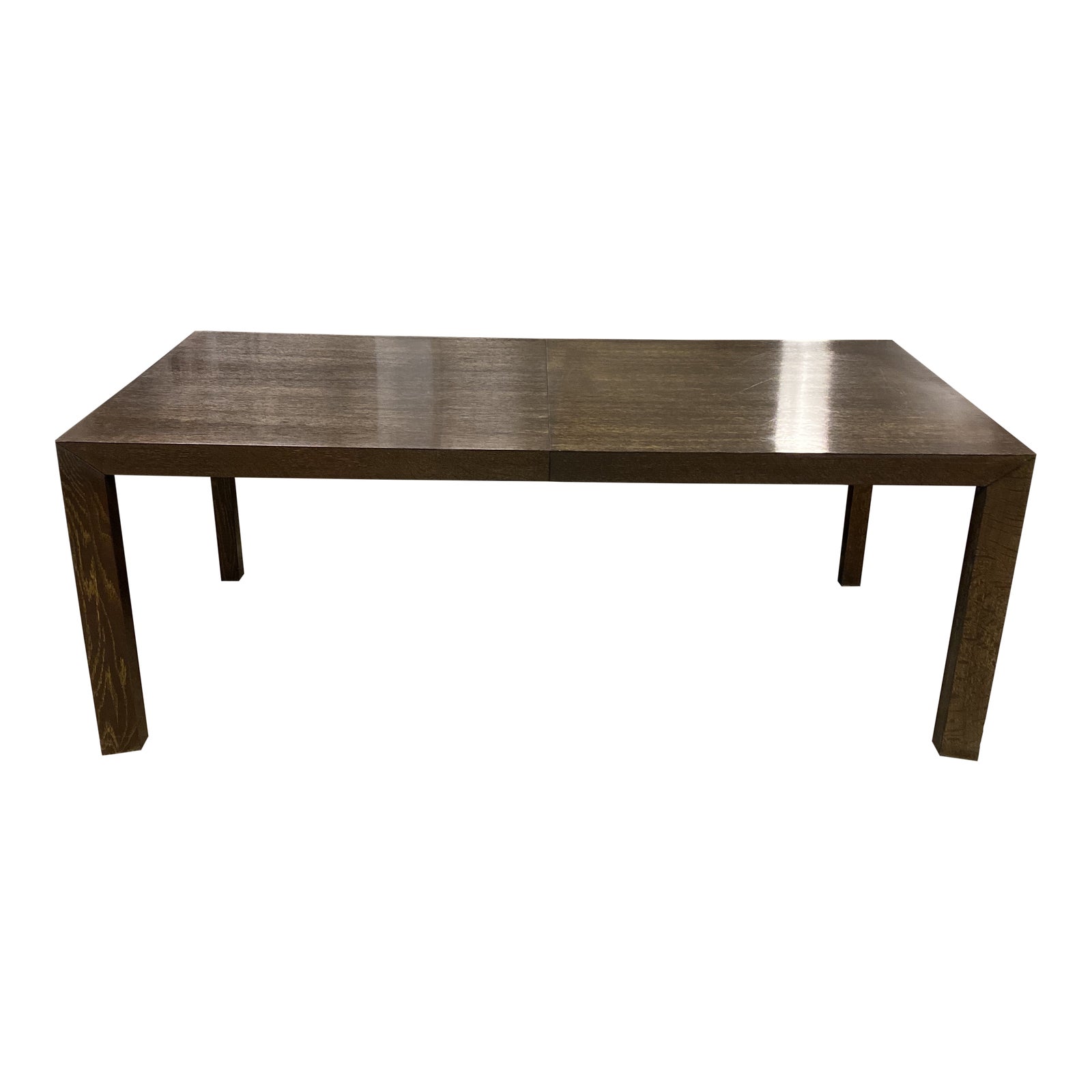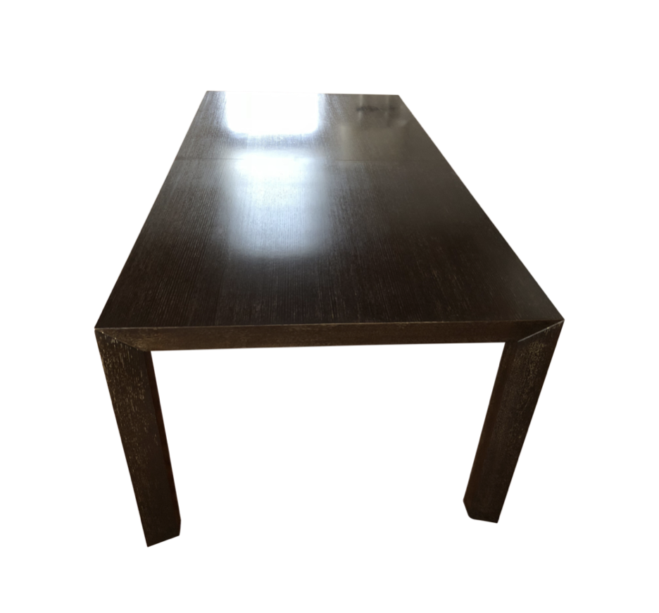 Design Plus Gallery presents a Parson Table by Baker Furniture. From the Baker Studio Collection Model No.BST9554. Crafted from solid woods and veneers. The finish is a dark limed oak finish that has subtle variations in the color. The Parsons table was designed by Jean-Michel Frank while he was working at Parsons Paris in the 1930’s. The style has become a design icon, distinguished by its clean angles and versatile design. Minor wear on frame. Made in Indonesia.