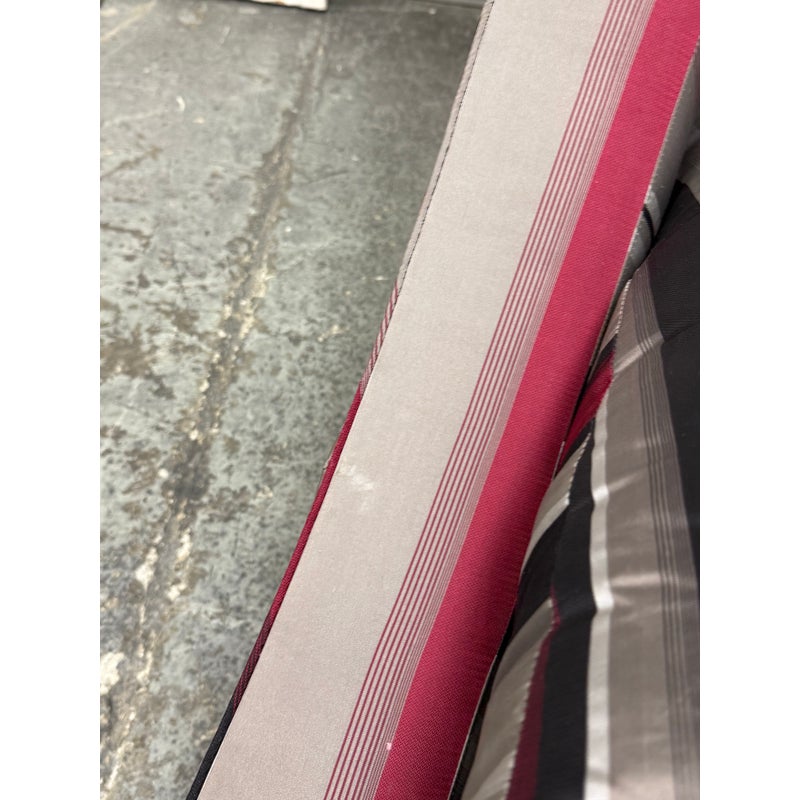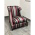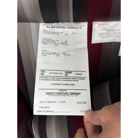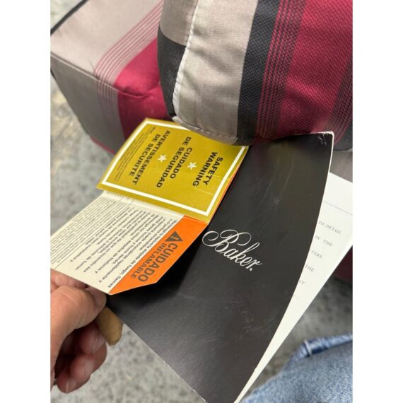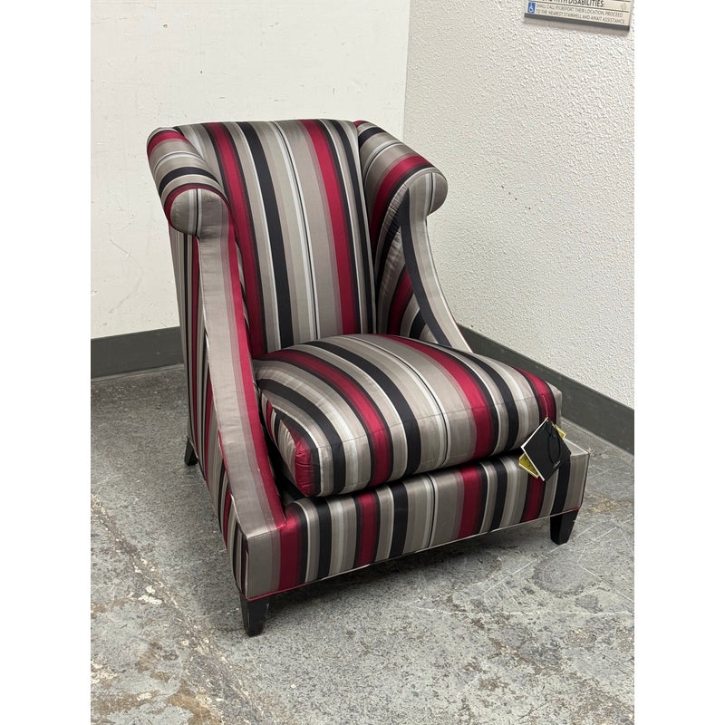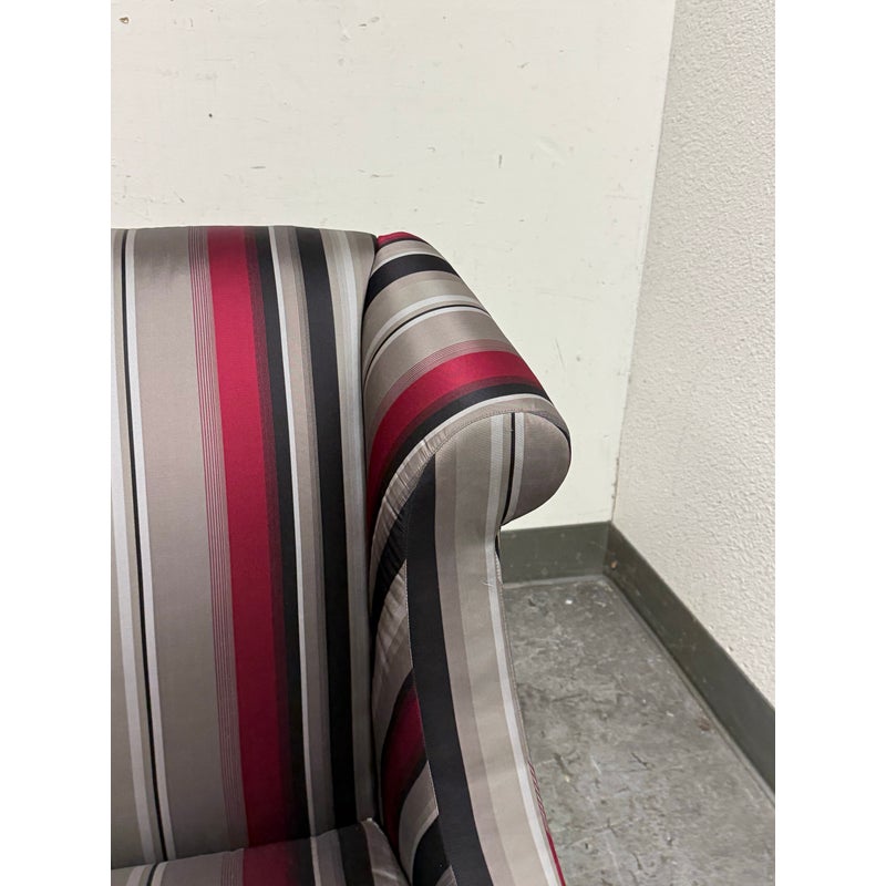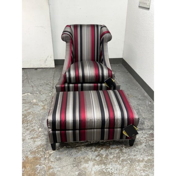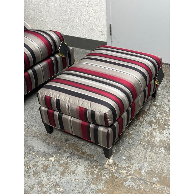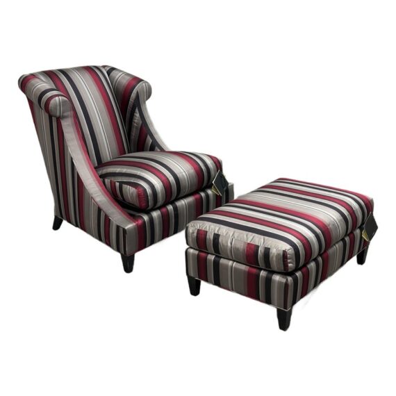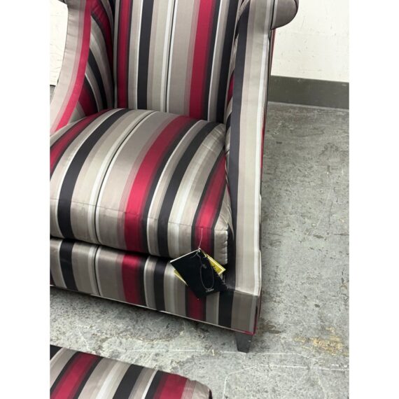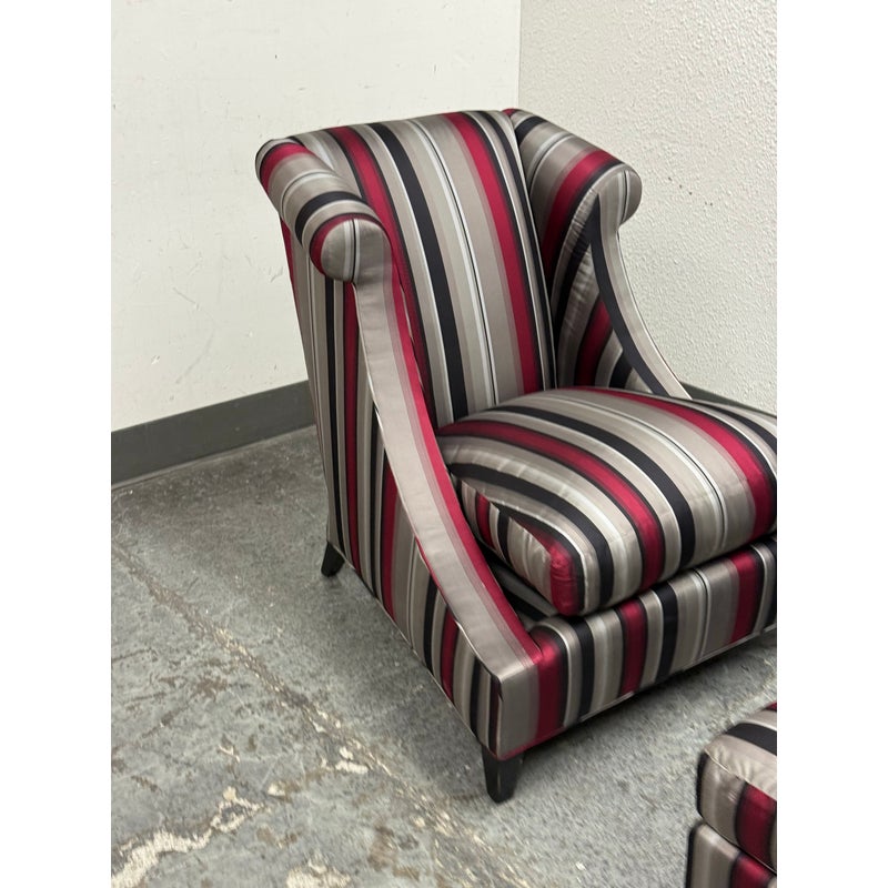 Design Plus Gallery presents Set of Rolled Arm Wing Chair + Ottoman from Baker Furniture. The set has a satin upholstery of gray with burgundy and black of varying sizes of stripes. The chair has a plush seat cushion that is removable and a perfectly proportioned ottoman to kick your feet up to and relax. The chair and ottoman are still in good condition, with tags on, and minor visible wear. Made in the USA.