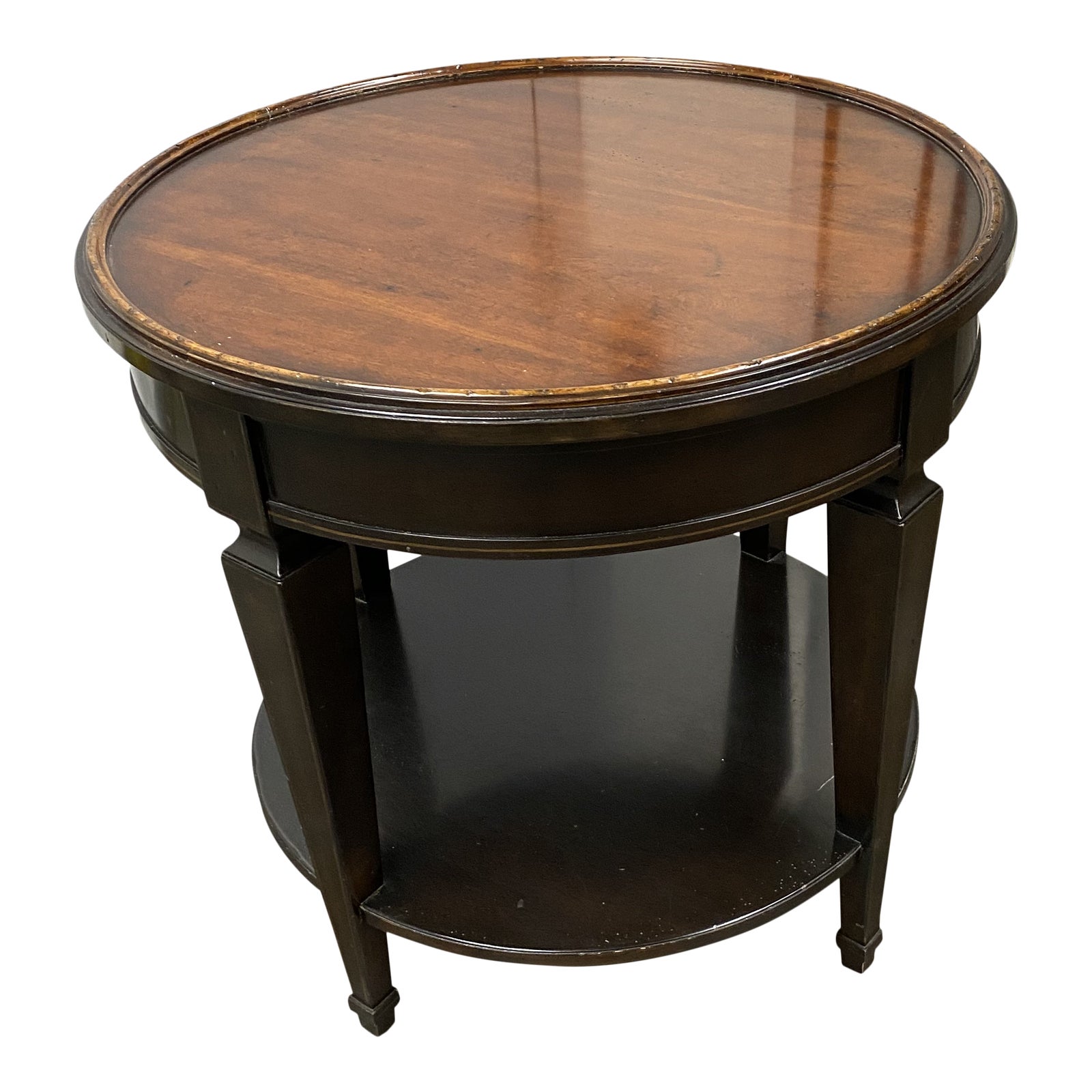 Design Plus Gallery presents a Baker Furniture round side table. Tapered legs support an open shelf on the base and thick top with an antiqued contrasting lip. Antiqued finish is echoed in thin lines around the legs and beneath the top. There is a small gauge in one of the legs. Minor wear on surfaces blend well with the dark espresso finish. Top and shelf have a satin finish to subtly reflect beauty of the surroundings