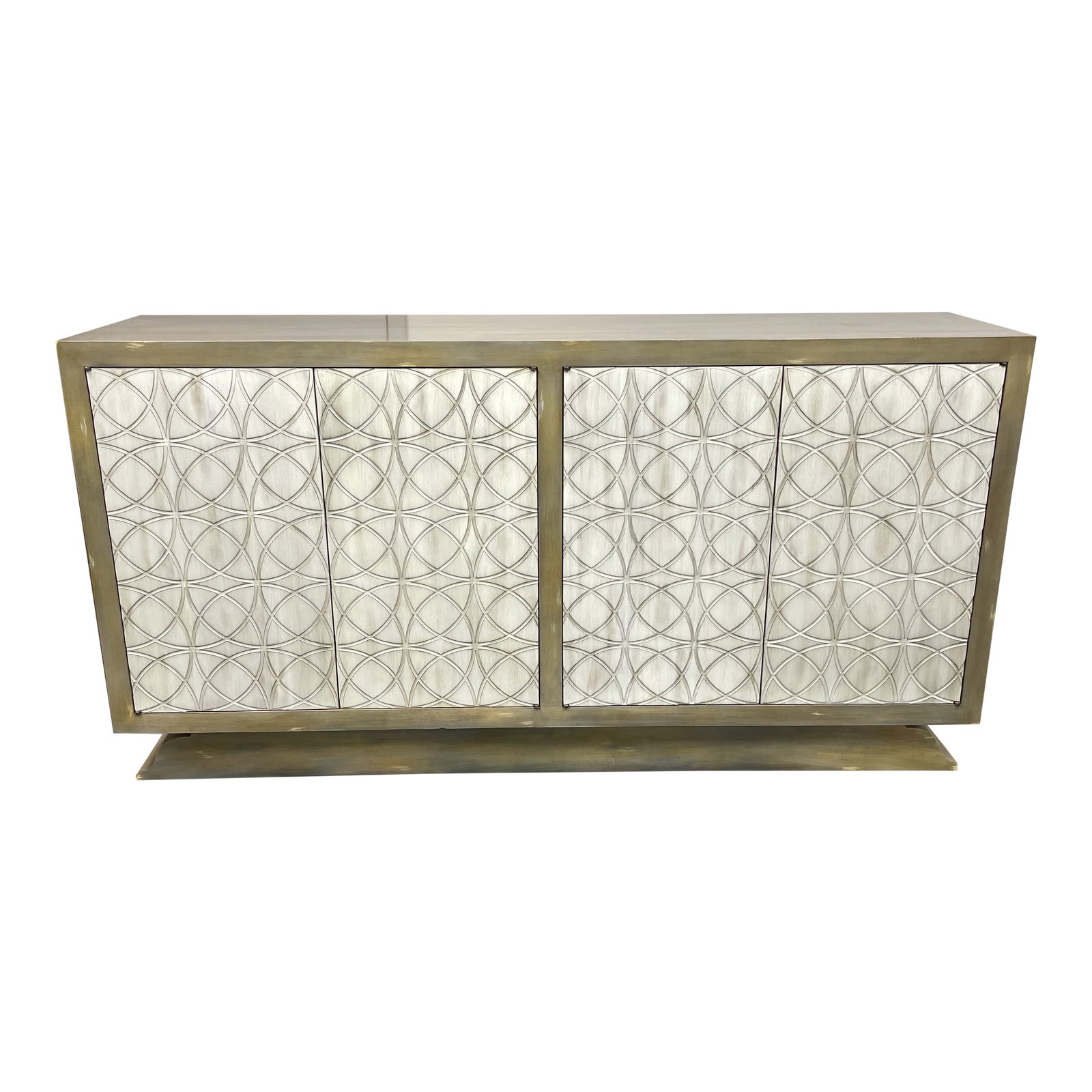 Design Plus Gallery presents a Baker Furniture Rustic Mid Century Modern Sideboard. Solid wood joinery and impeccable finishing is what renown furniture maker Baker is known for. This unique piece is a discontinued style with sculptural door fronts. Doors have been etched with mid century influenced motifs on the ivory painted cabinets. Interior offers ample storage opportunity with adjustable shelving and a pair of small drawers on each side in a warm salmon tone. Exterior is painted a rustic finish. There is some visible wear through out, sideboard is in good condition.