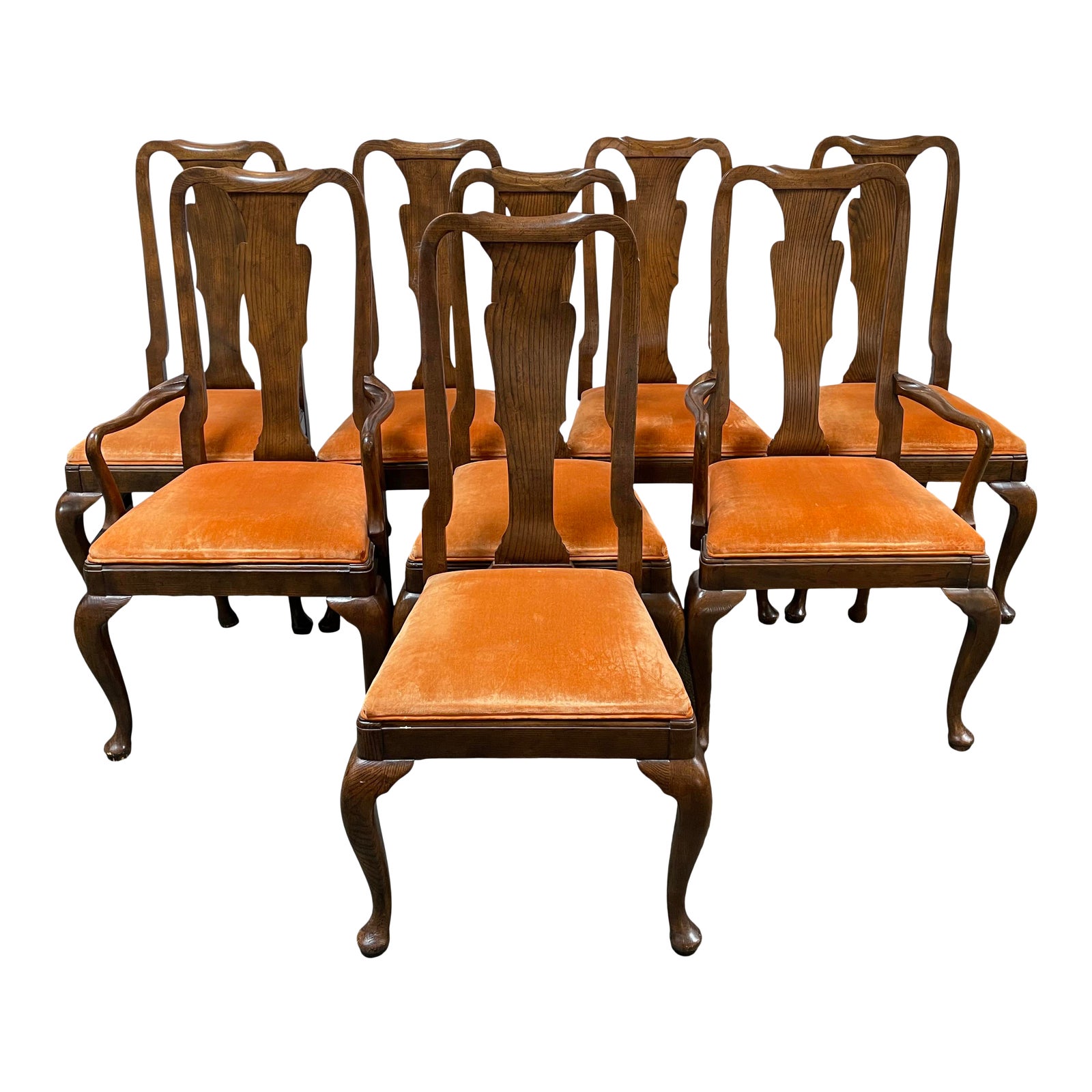 Design Plus Gallery presents a Set of Eight Velvet Chairs by Baker Furniture Company. Light carving and curves details are found on the apron as well as all chairs. The eight chairs are upholstered in a warm apricot velvet. An elegant set for large or small gatherings.