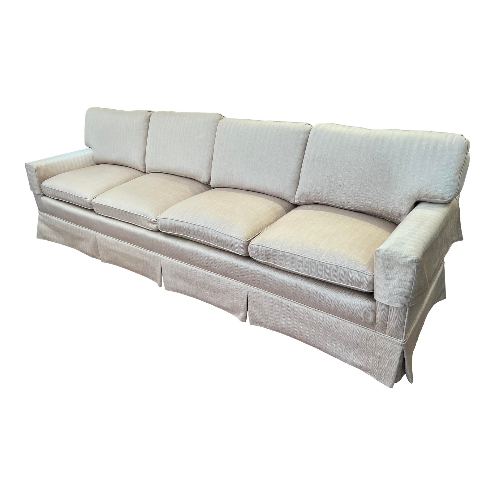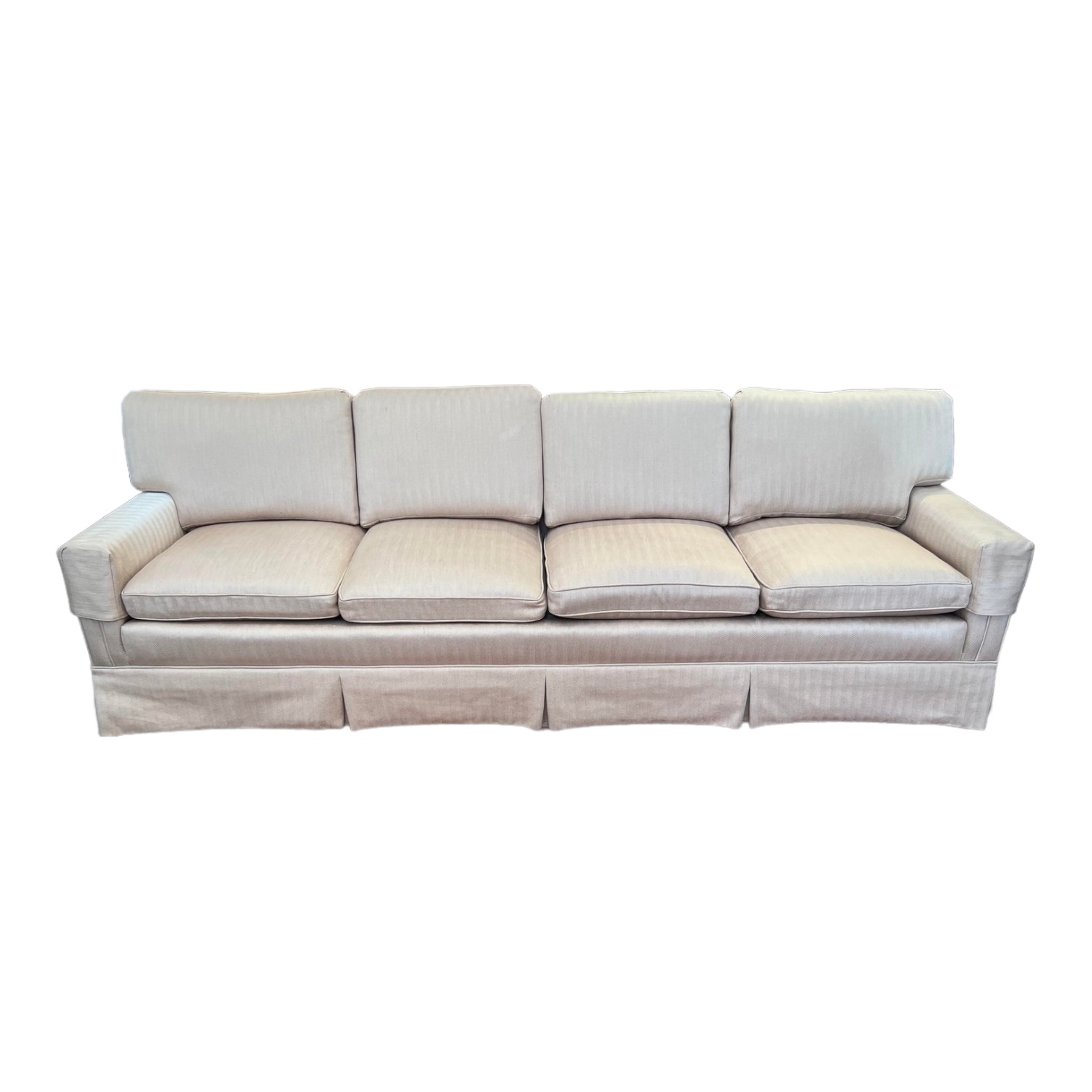 Design Plus Gallery presents the Baker Furniture Traditional Sofa. This classic Baker sofa features four seating and four back cushions. Aprons drape over the legs and underside of the sofa. Upholstered in beige wool with a subtle alternating chevron/stripe pattern. Originally purchased in 1985 for $15,000. There is some cleaning damage and a lot of fading; the sofa is in good condition.