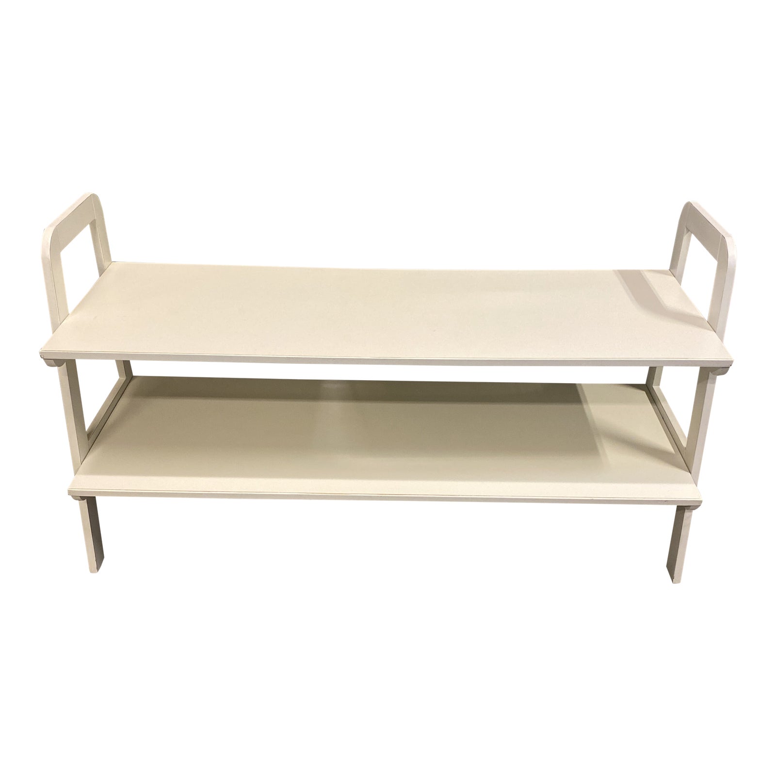 Design Plus Gallery presents a media cabinet by Ballard Designs. The finish is an off-white. A two-level media cabinet, suitable as a low bookcase as well. Minor wear.