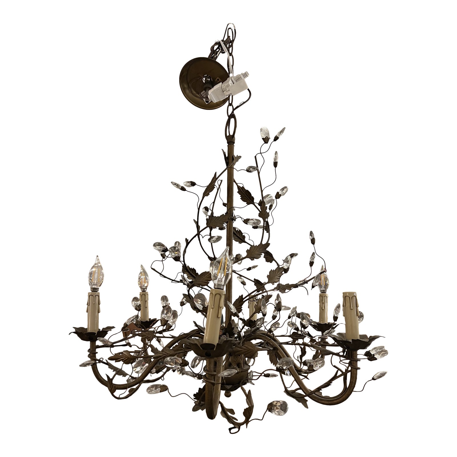 Design Plus Gallery presents the Claire Grande Chandelier by Ballard Designs. The six candle arms are entwined with leafy vines in a matte bronze finish, further embellished with faceted cut-glass crystals that reflect light around your space.