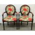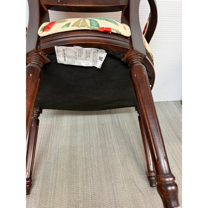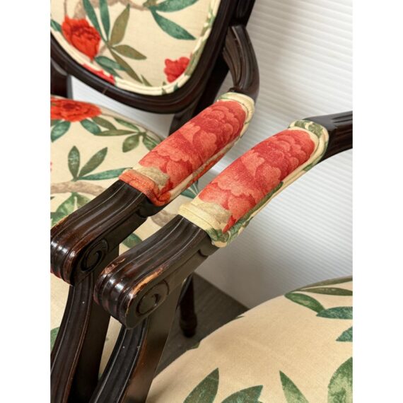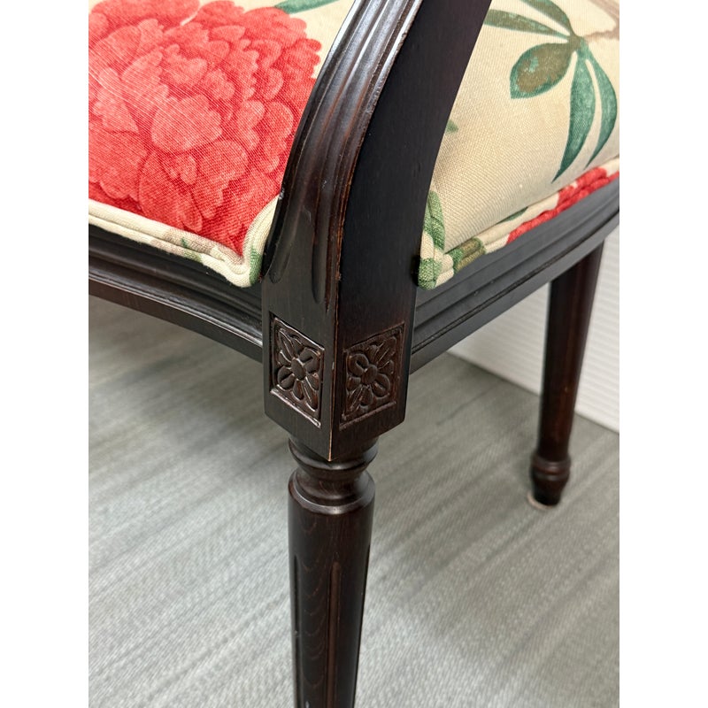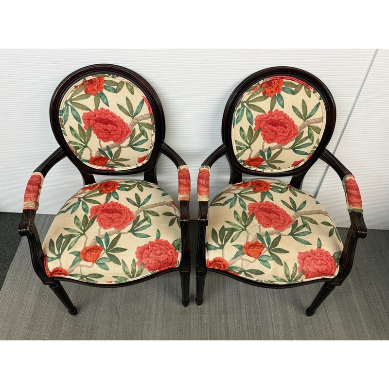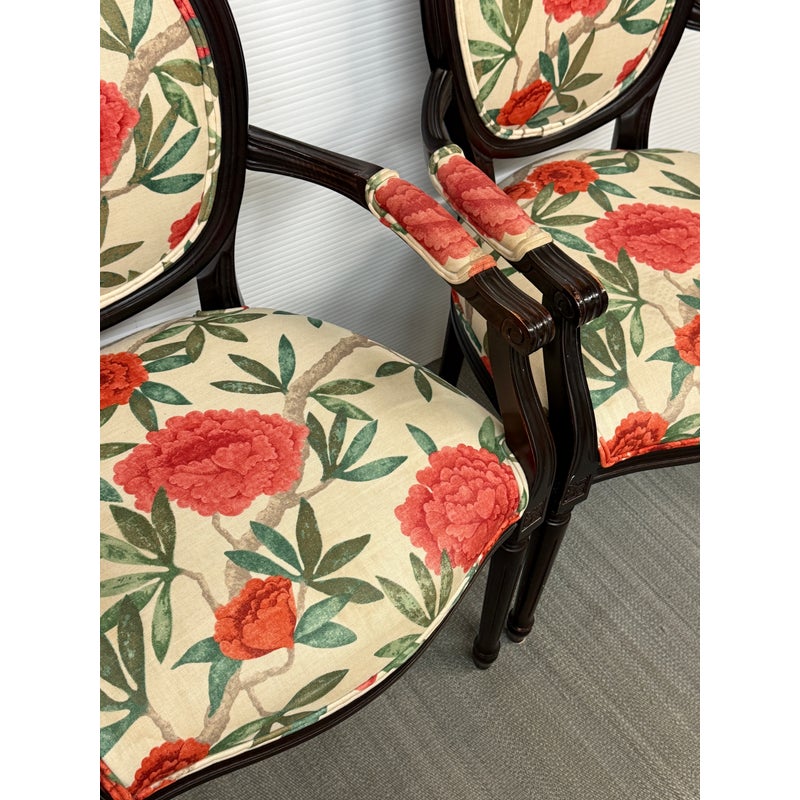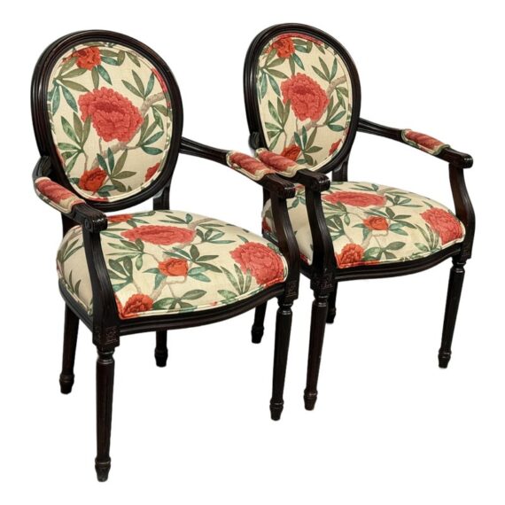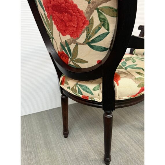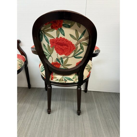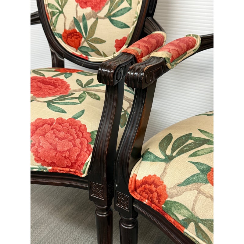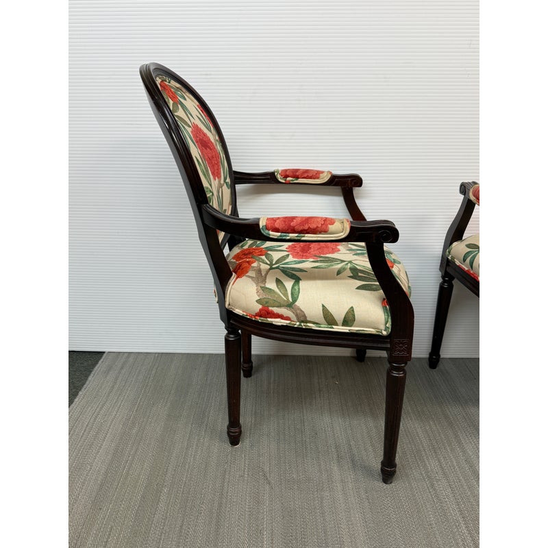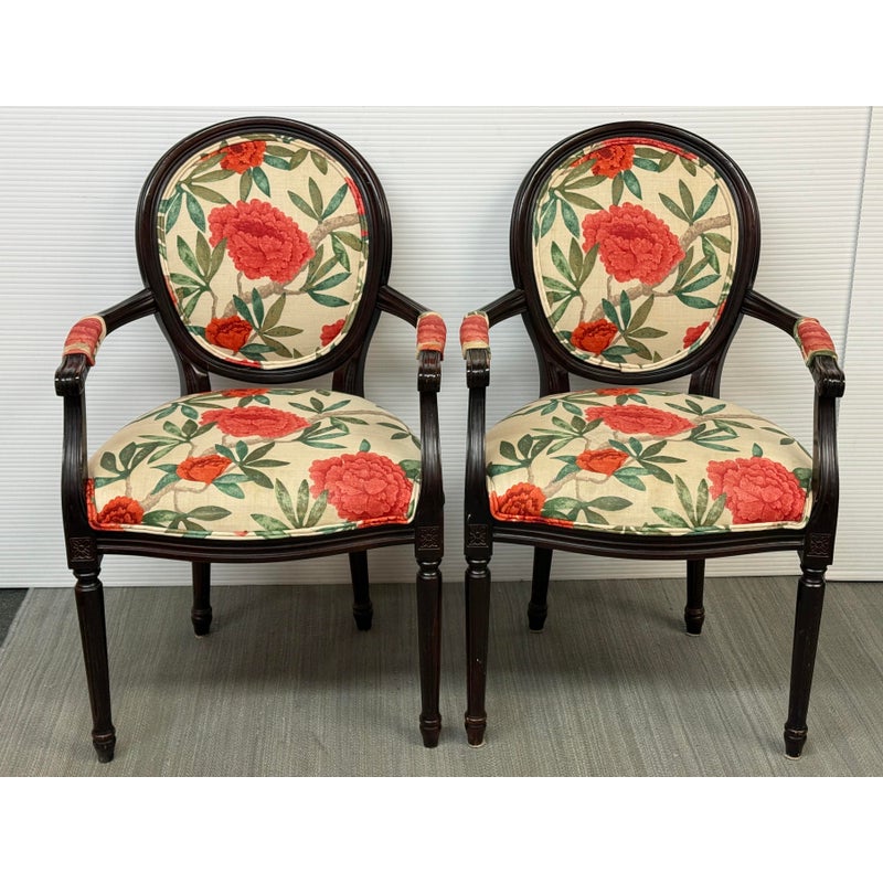 Design Plus Gallery presents a Pair of Louis XVI Arm Chairs from Ballard Designs. The elegant oval back silhouette feels just as relevant today as they did two centuries ago. Classic in every detail, the frame is hand crafted in Italy of solid beechwood and stained a rich brown. The arms, back, and seat are comfortable cushioned and upholstered with a bold floral fabric. The fluted legs are tapered and set with hand carved floral accents. Minor surface wear from use, chairs are in good conditions. Made in Italy.