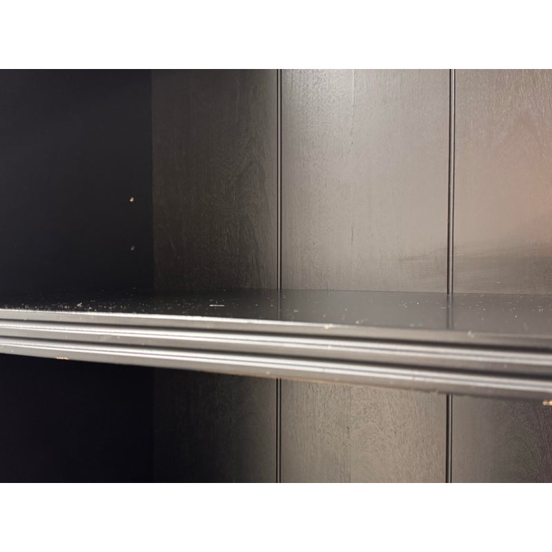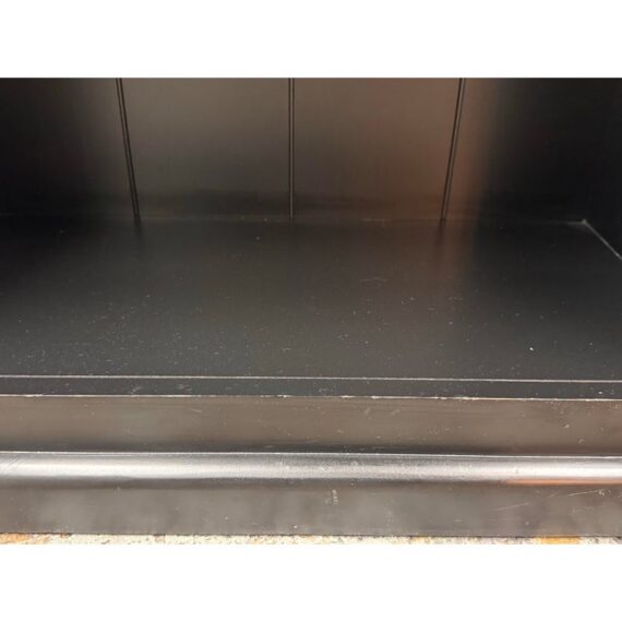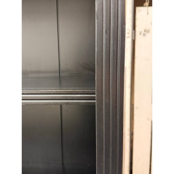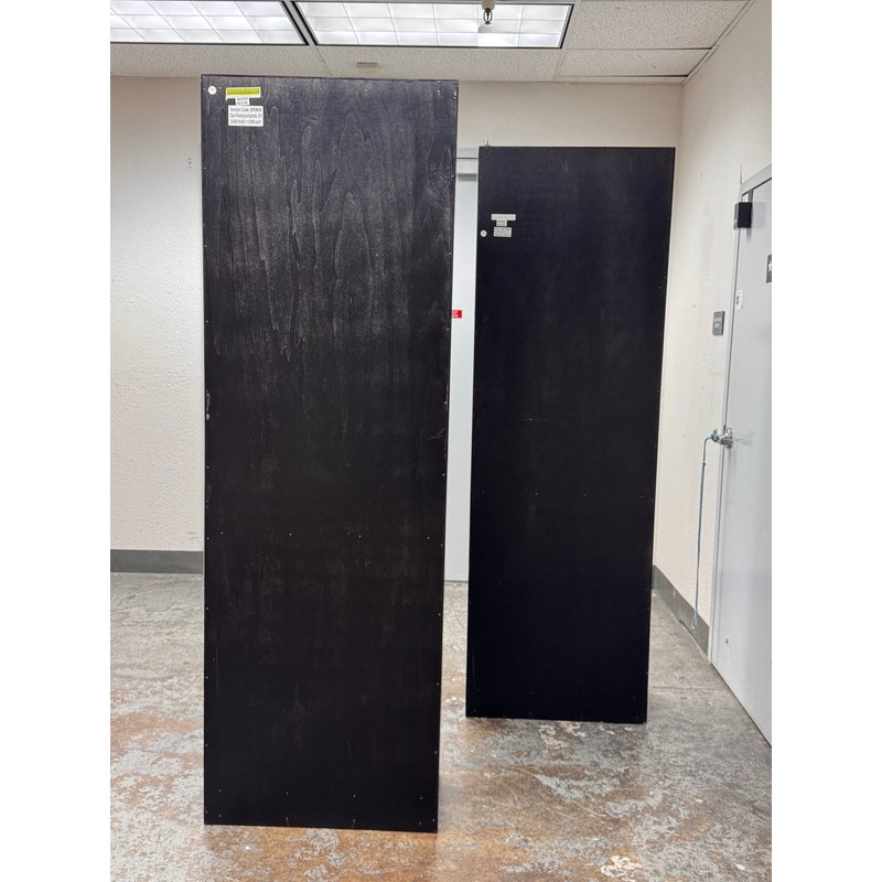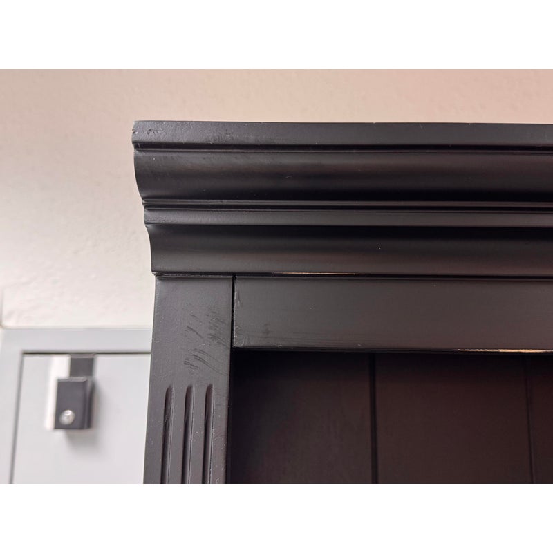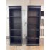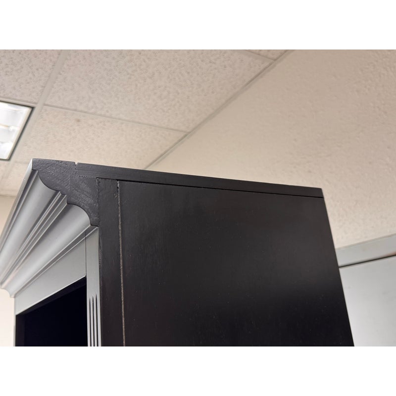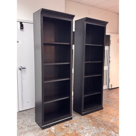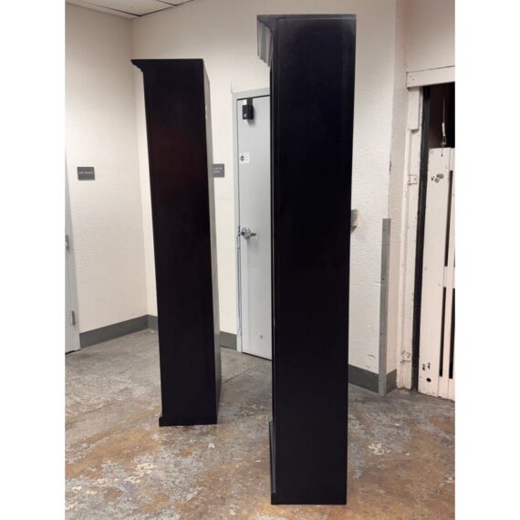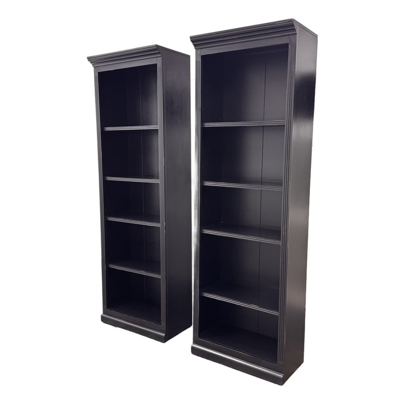 Design Plus Gallery presents a Pair of Tuscan Flush Bookcases from Ballard Designs. This tall, rectangular bookcase is defined by a classic architectural profile with a molded crown top, fluted front detailing, and a paneled back interior. The structure includes multiple adjustable shelves that allow for flexible spacing, framed within solid side panels and supported by a plinth base. The black painted surface highlights the linear form and traditional design influences associated with the Tuscan collection. These are discontinued models with the brand, they are in good condition, visible and minimal wear from usage.