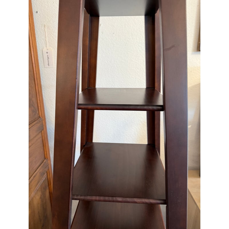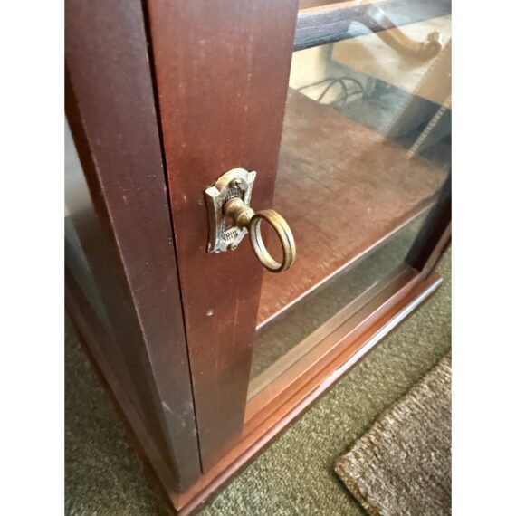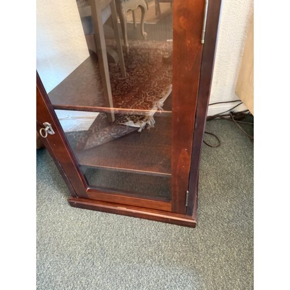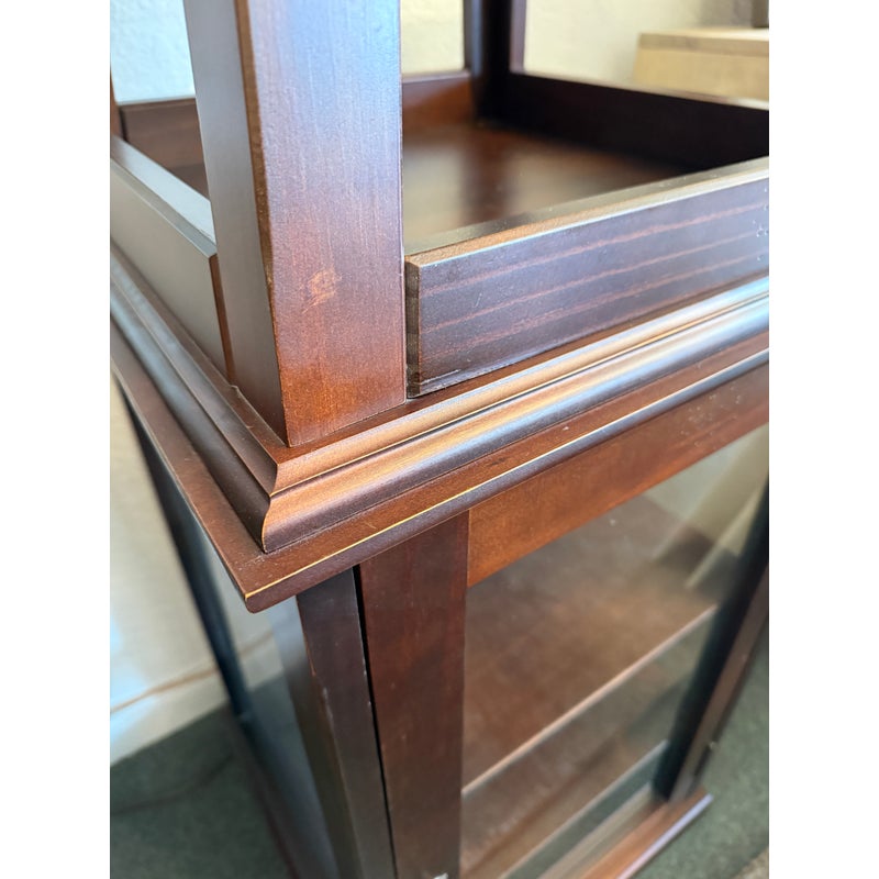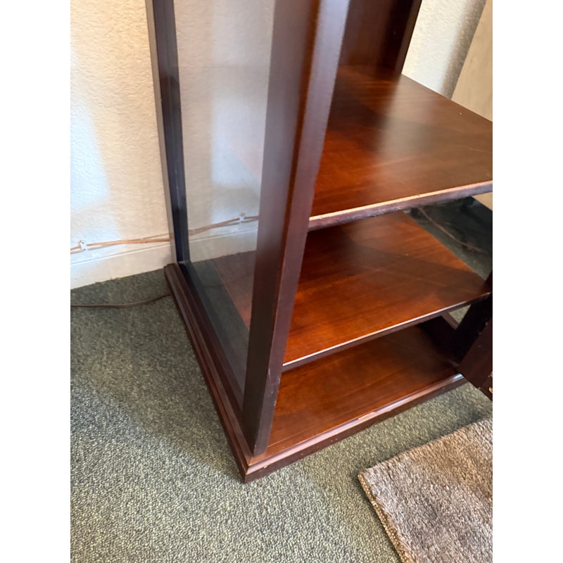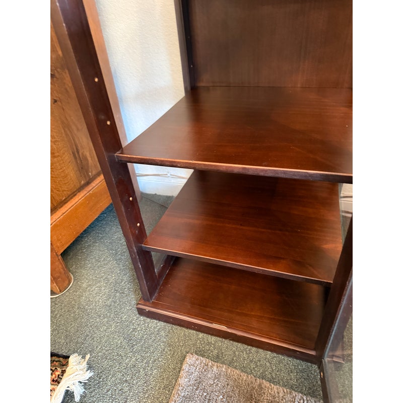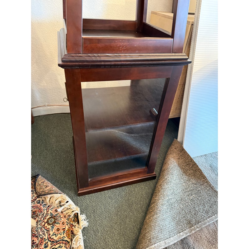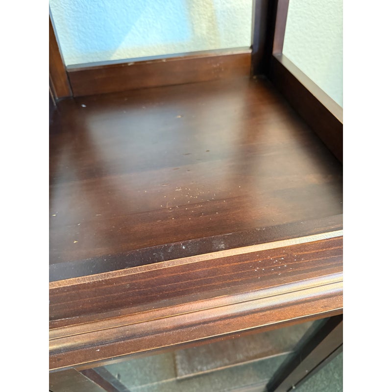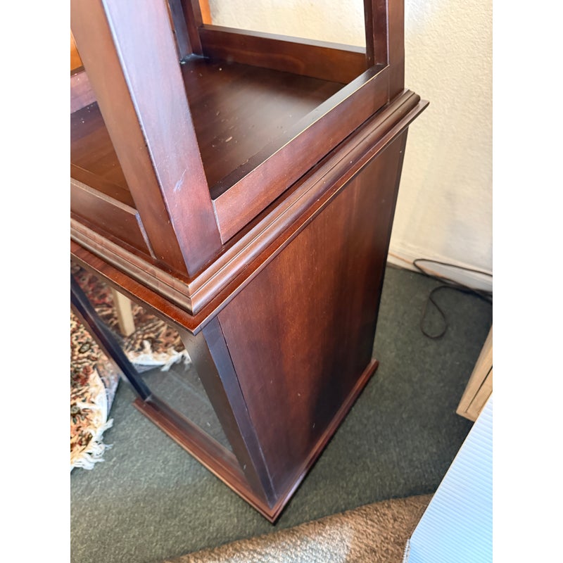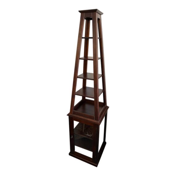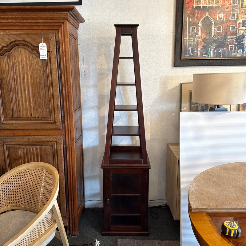 Design Plus Gallery presents a Traditional Obelisk Etagere By Ballard Designs. With a classic silhouette, the shelving offers both open display above and closed but adjustable display below. Classic beveled edges and brass fittings finish the look. Light surface wear; condition is fair for age and use.