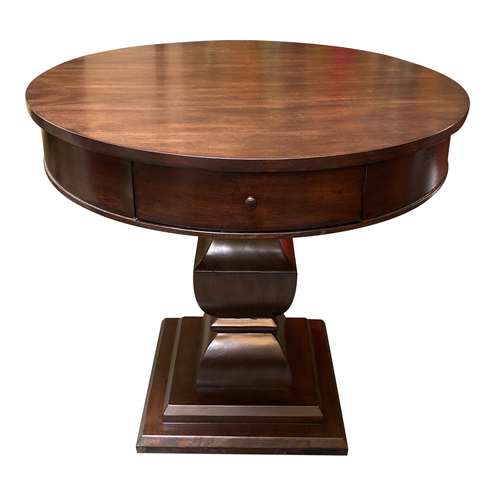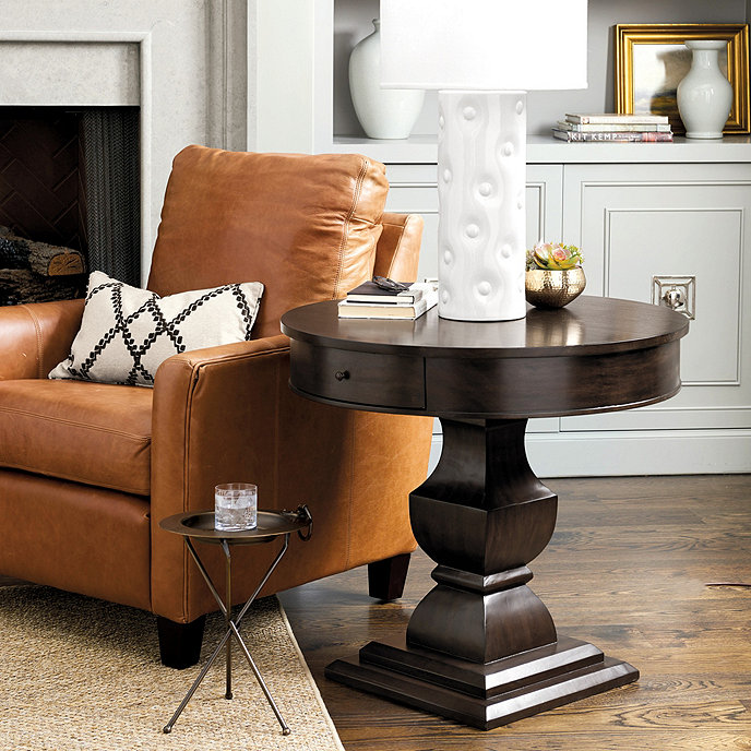 Design Plus Gallery presents a Ballard Designs Doran Side Table Walnut Stain. A side table worthy of a pedestal! Doran Table stands on a substantial turned wood base with carved vase column and generously scaled round top. The deep apron accommodates a single storage drawer with bronze metal pull. Made of a Mahogany with veneers.