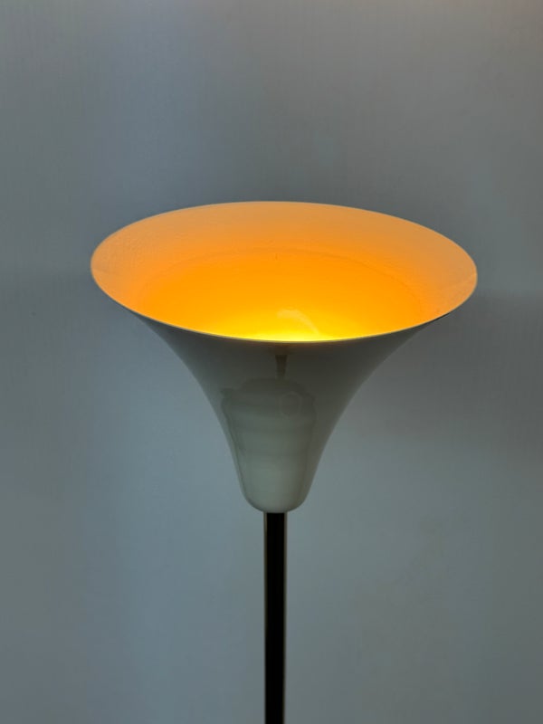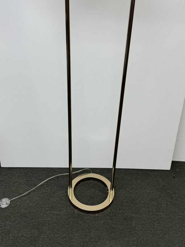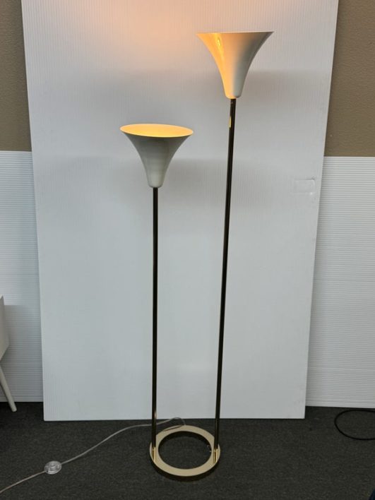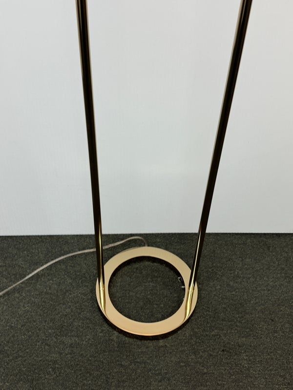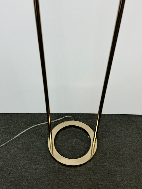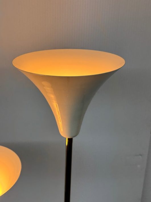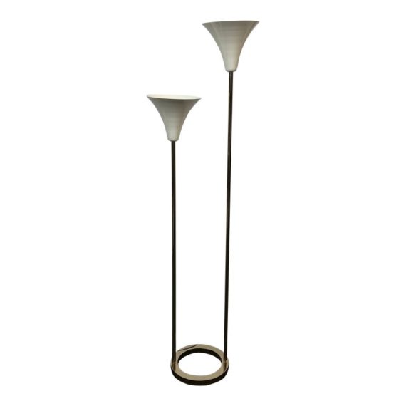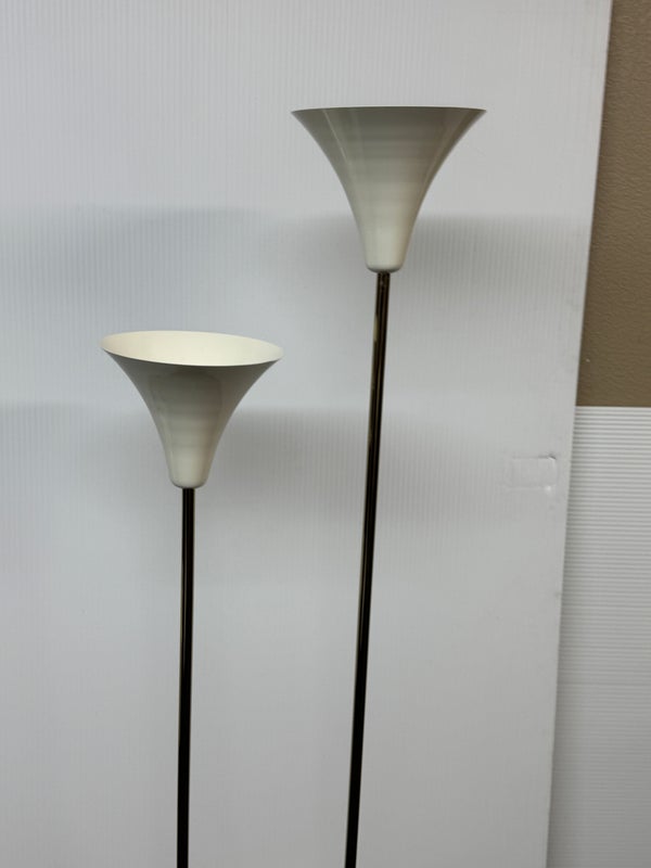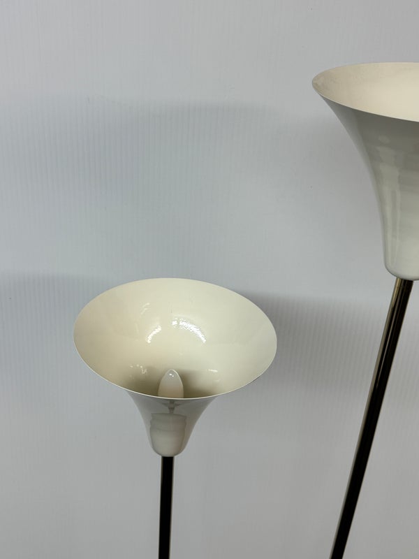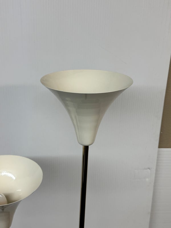 Design Plus Gallert presents a Cypress Two Light Floor Lamp by Cb2. Italian-inspired design by Balutto Associati shines in a sleek frame with two ivory enamel shades. Standing tall, the tulip shades add a vintage touch. In good condition, minimal wear from usage + age.